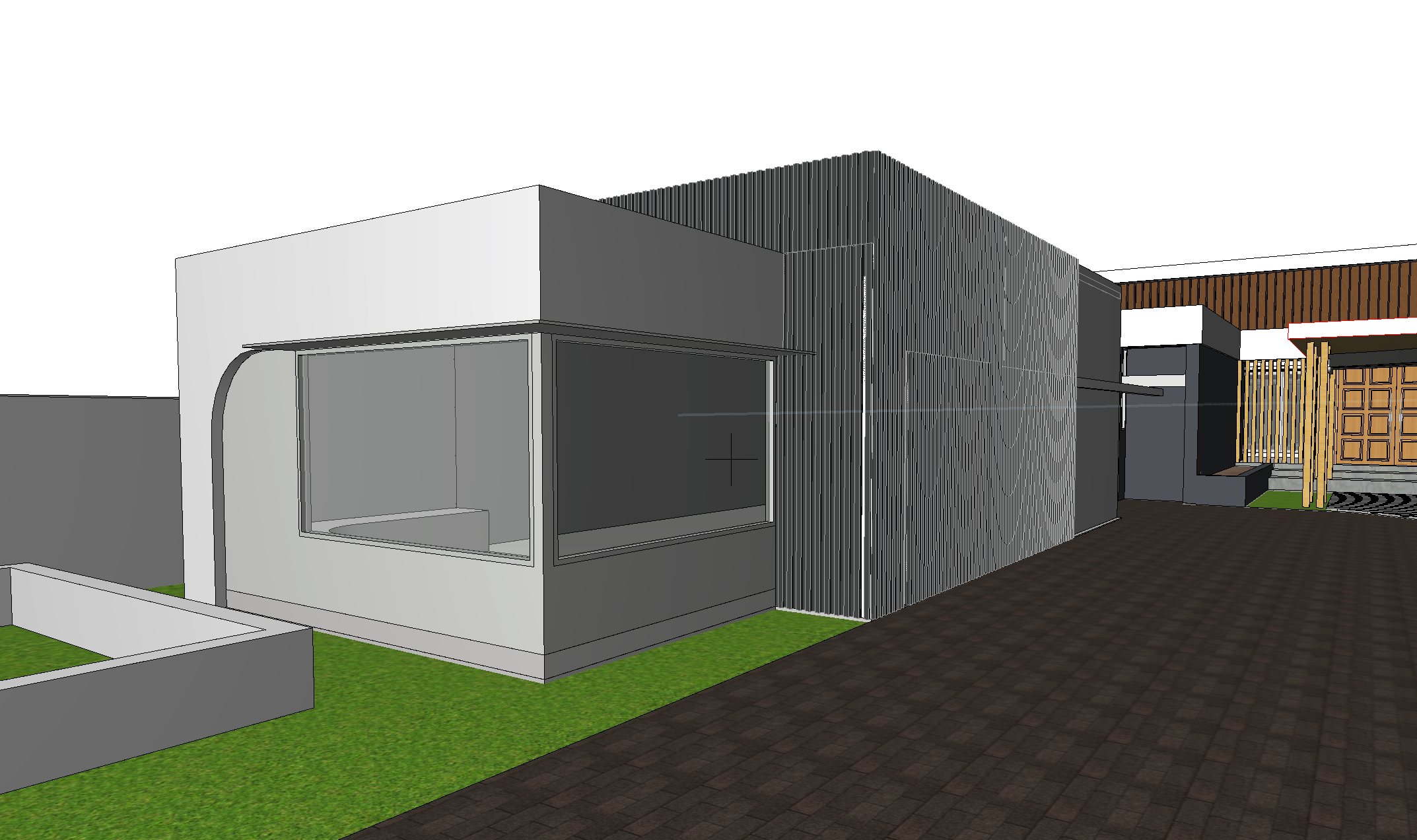 create a 3d render from the image showing a garage show a tree in the planter on the left side of the image make the vertical cladding monument colour and the other walls a white render add planting to the grass areas