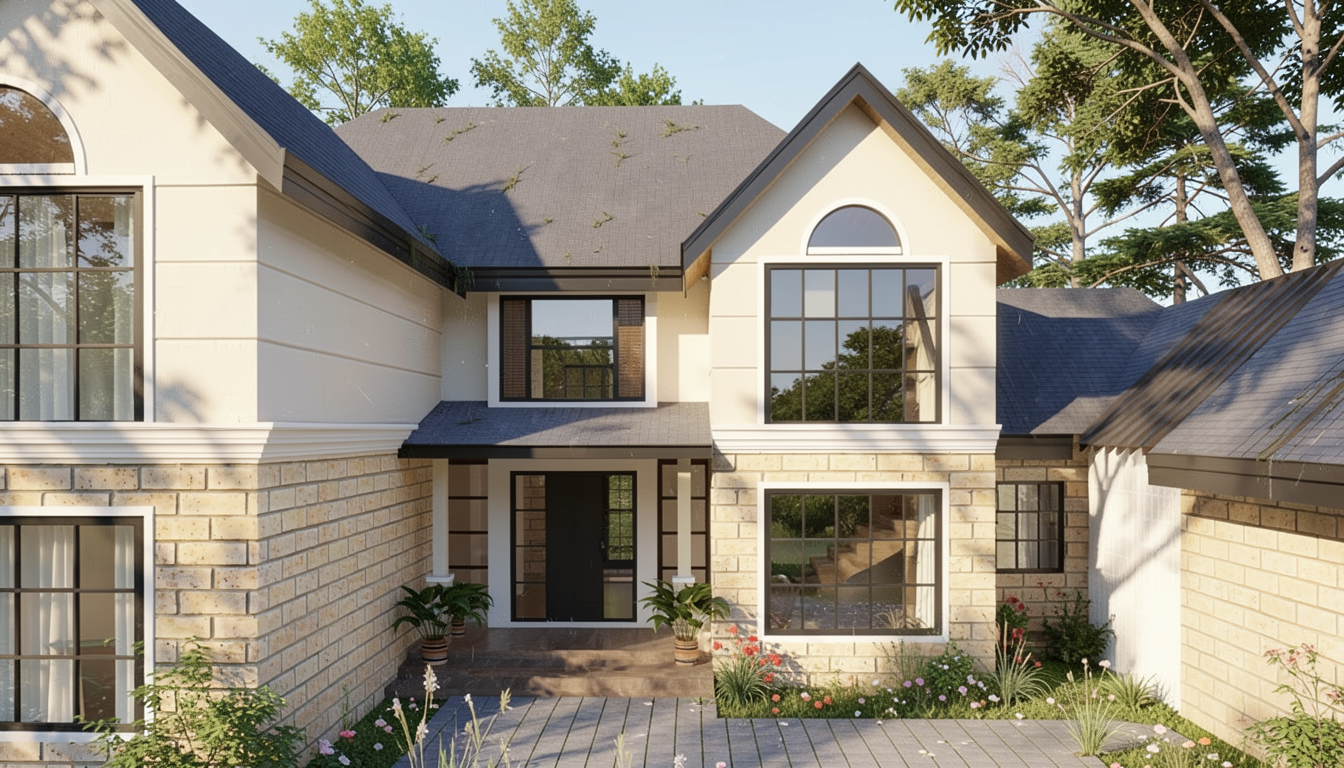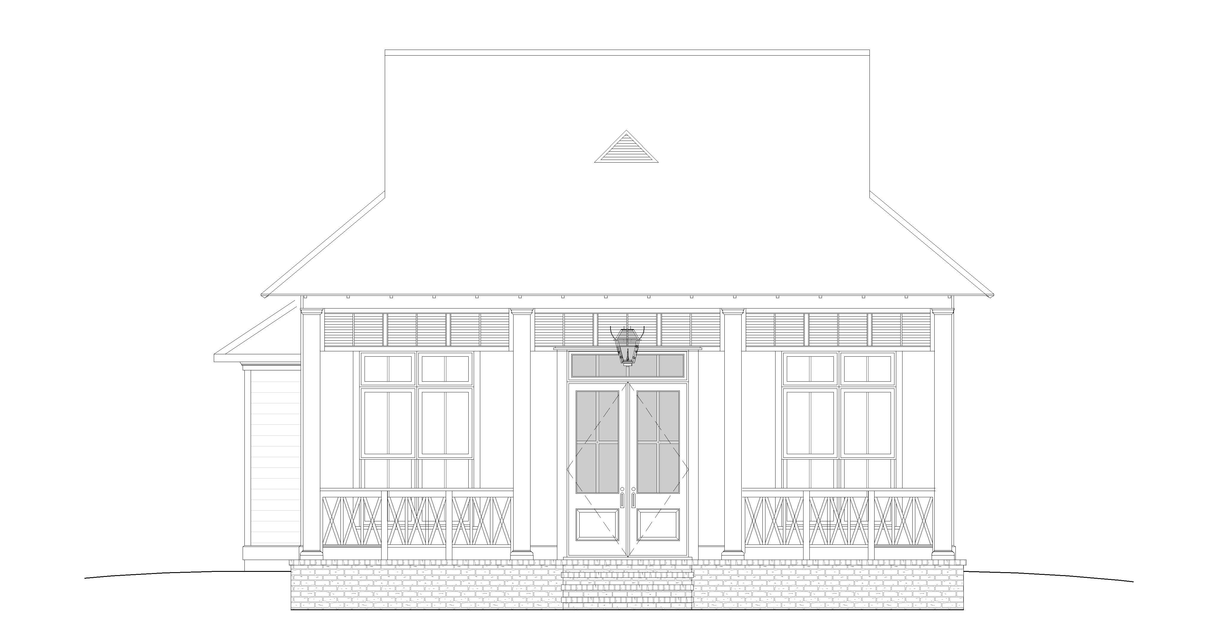 use the provided 2d line drawing as the exact geometry reference maintain all proportions wall locations roof forms window and door placements do not redesign or reinterpret the architecture architectural style refined southern traditional inspired by a hays town materials hrdie siding exterior warm white wood shutters muted green natural wood front door lighting soft morning light long shadows natural sky slightly warm tone environment mature landscaping realistic grass subtle imperfections no overly dramatic sky