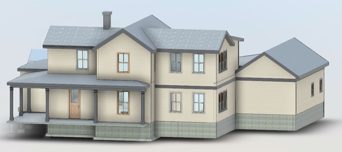 photorealistic architectural exterior render of a virginia farmhouse residence with a balanced front addition the house features white clapboard siding a medium grey asphalt shingle roof and a wrapped front porch roof that continues seamlessly across the fa ade unifying the original structure and the addition the addition is well proportioned and visually balanced matching roof pitch eave depth window alignment and trim details of the existing house so it reads as a cohesive design the porch is ground level 1 step up simple taper square white columns a modest farmhouse railing and a welcoming entry windows are vertically proportioned with traditional farmhouse trim set in a virginia rural setting with gentle rolling landscape mature trees and soft grass natural daylight with soft shadows realistic materials accurate scale and true to life textures ultra realistic lighting crisp details neutral color balance eye level camera view architectural photography quality no stylization keep windows and doors in original location