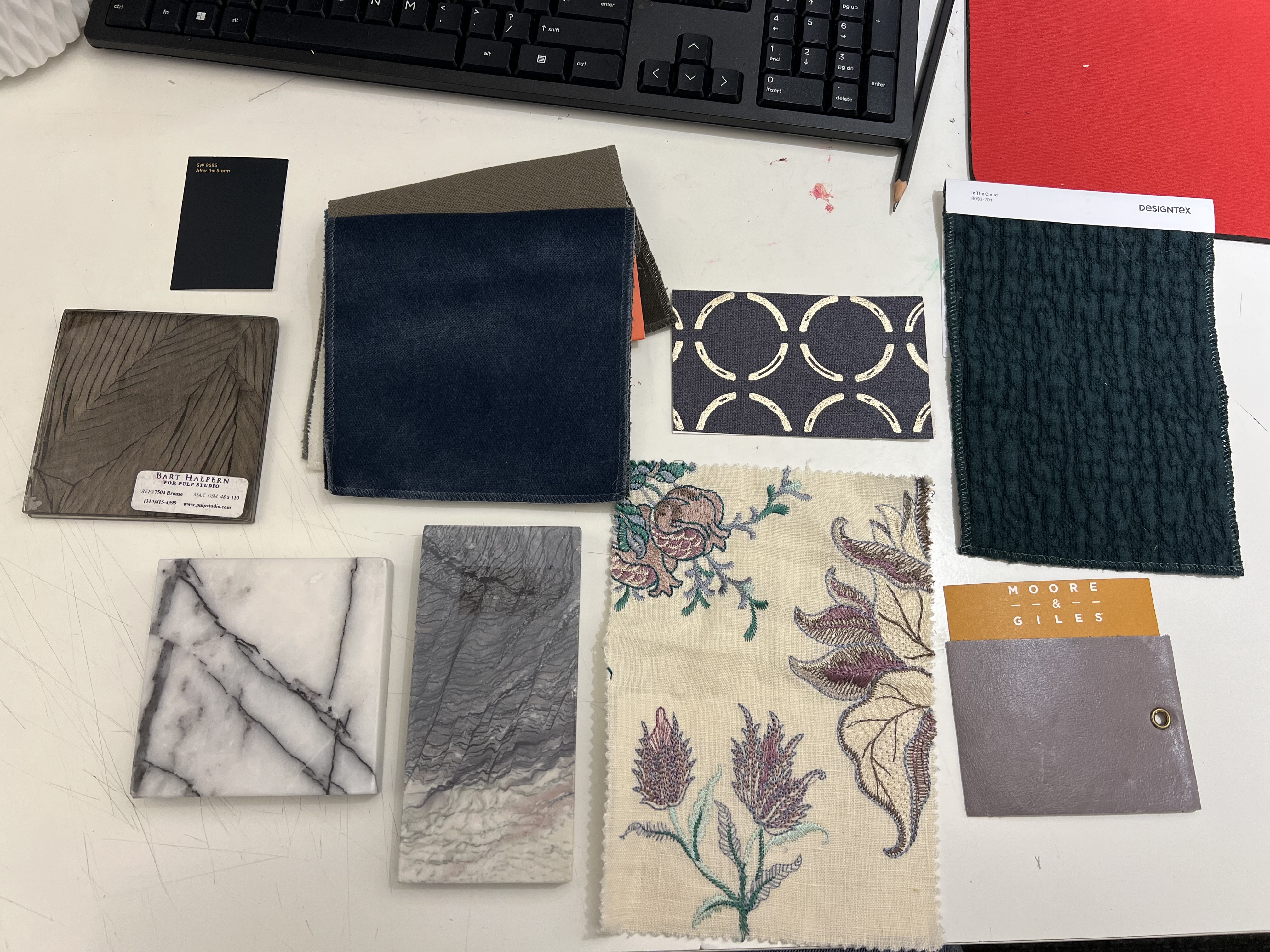 exterior shot award winning boutique hotel bar curved island bar clad in dramatic book matched breccia viola marble walnut arched back bar with antique mirror niches and warm brass led shelving teal glazed zellige tile backsplash navy velvet curved bar stools with unlacquered brass legs dark teal hand printed botanical wallcovering deep mauve channel tufted banquette palm plants brushed brass globe pendants herringbone walnut floors candlelight