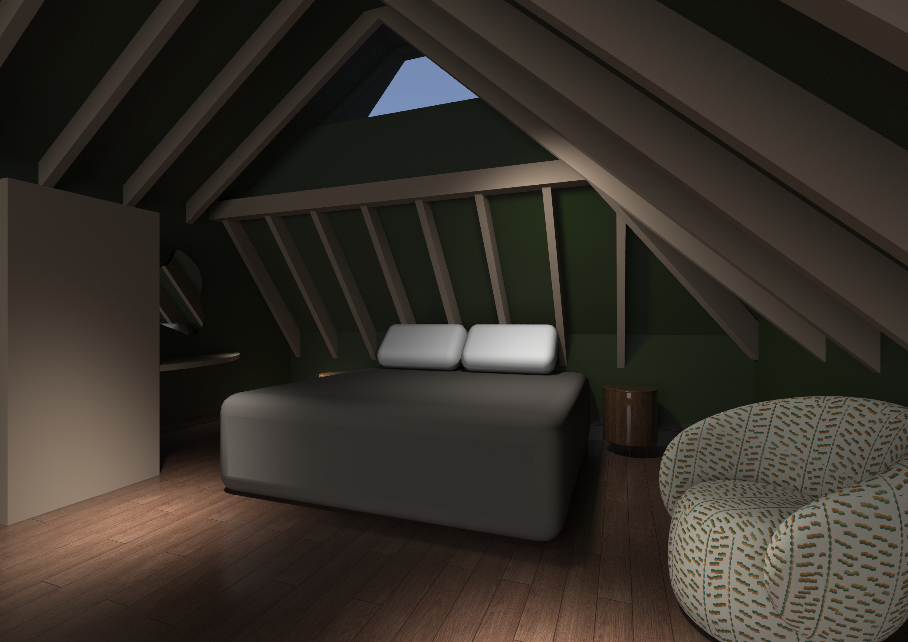 exterior shot using the first image as the primary reference for style color palette and atmosphere redesign the space shown in the second image transform the attic bedroom into a lush biophilic luxury retreat inspired by organic forms and nature incorporate a rich green color scheme soft ambient lighting and curved elegant furniture similar to the reference replace the current bed with a plush sculptural bed featuring a rounded or upholstered headboard add large indoor plants natural textures wood stone fabric and decorative elements that evoke a serene high end jungle inspired environment adapt the slanted ceiling architecture by integrating warm lighting hidden led strips or hanging fixtures and emphasize vertical lines or soft arches where possible include a statement ceiling light inspired by floral or organic shapes enhance the windows or openings to feel more expansive and connected to nature even if simulated maintain realism high detail soft shadows and a cozy yet luxurious mood the final result should feel like a tranquil nature infused sanctuary while preserving the structure of the second image