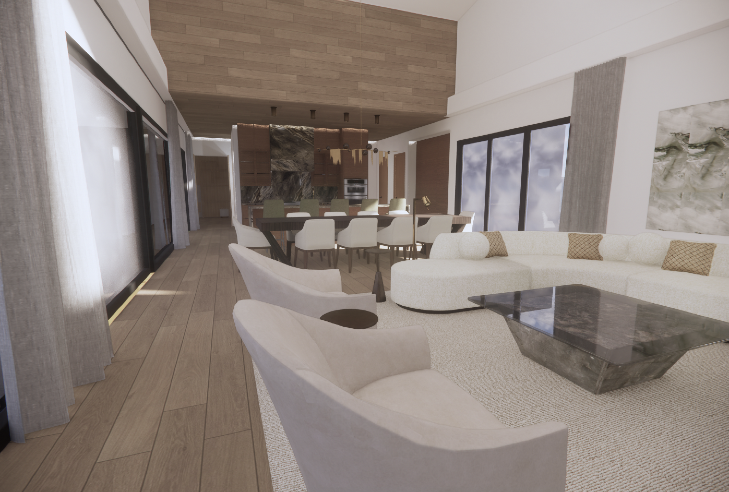 make the curtains a sheer light grey linen fabric the coffee table should be illuminated onyx the rug should be a cream geometric hide rug by kyle bunting the light fixture over the dining table is the cherry bomb by lindsay adelman