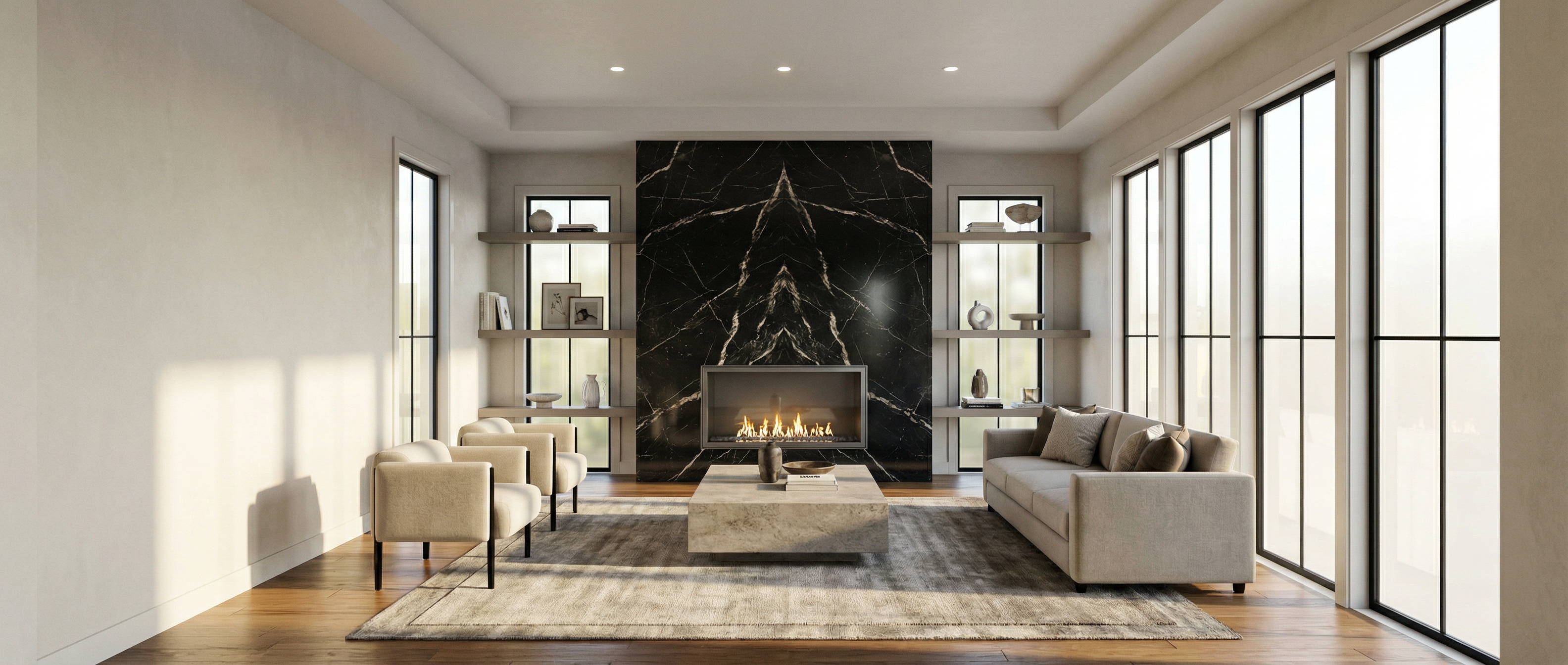 a mountain modern with greyish brown horizontal wood siding black standing seam metal roofing the stone is creamy white clean cut dry stacked stone the aluminum metal paneling is dark gray retain the exact structure window arrangement patio columns balcony chimney rooflines foundation height and proportions exactly as shown in the reference image surround the property with a lush dense forest of tall mixed evergreens and hardwoods make the environment a bright sunny day with a few fluffy clouds add plants and landscaping around the exterior to add some color add furniture on the balcony and the patio create ultra realistic lighting crisp shadows detailed textures in the wood siding metal roof and glass reflections