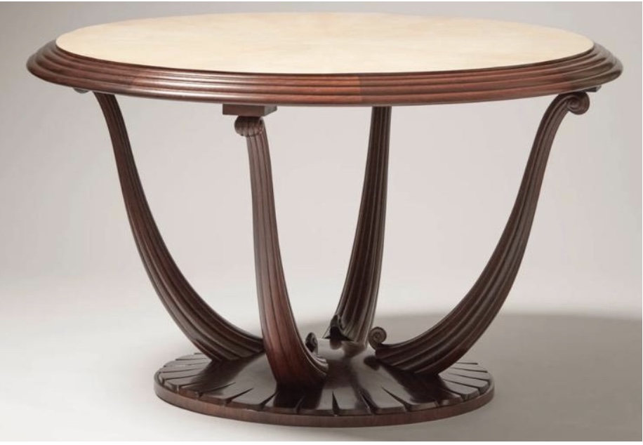 art deco interior shot do a render of this classic table but get rid of the ornamental parts on the base and the edges of the leg render it in an empty white studio with no other elemnts and soft lighting architecture