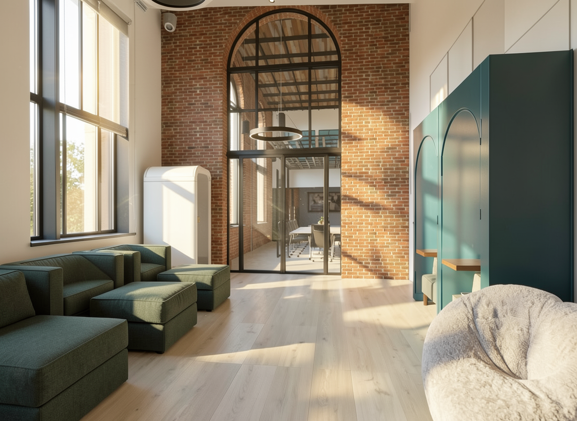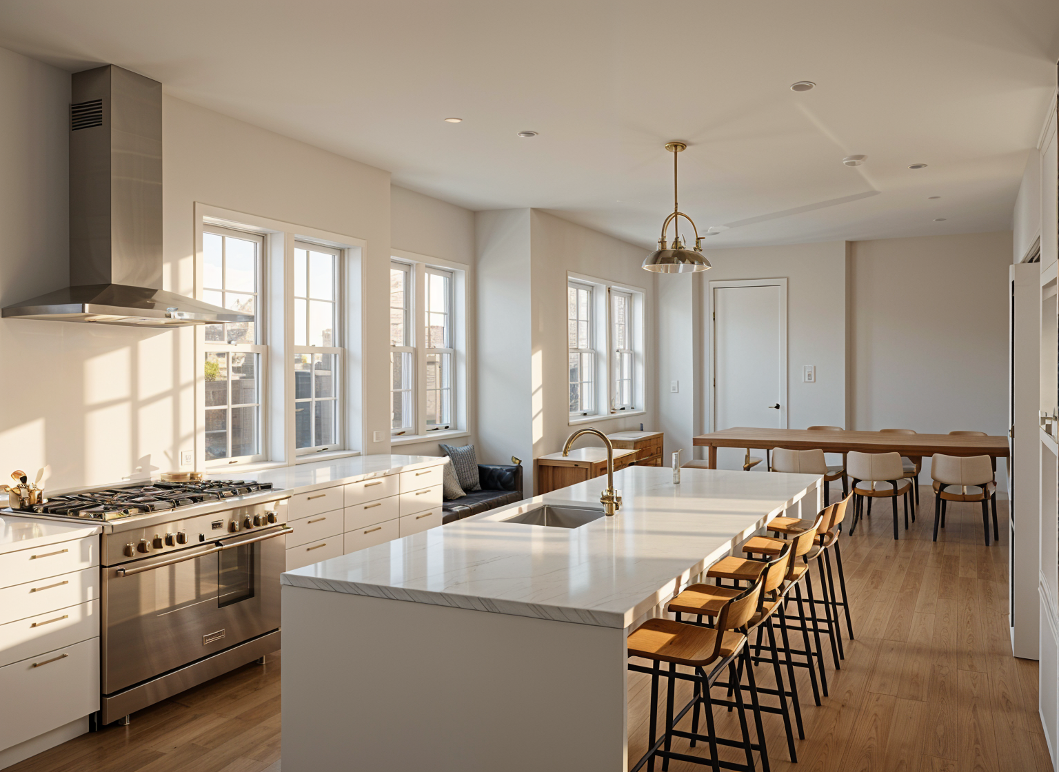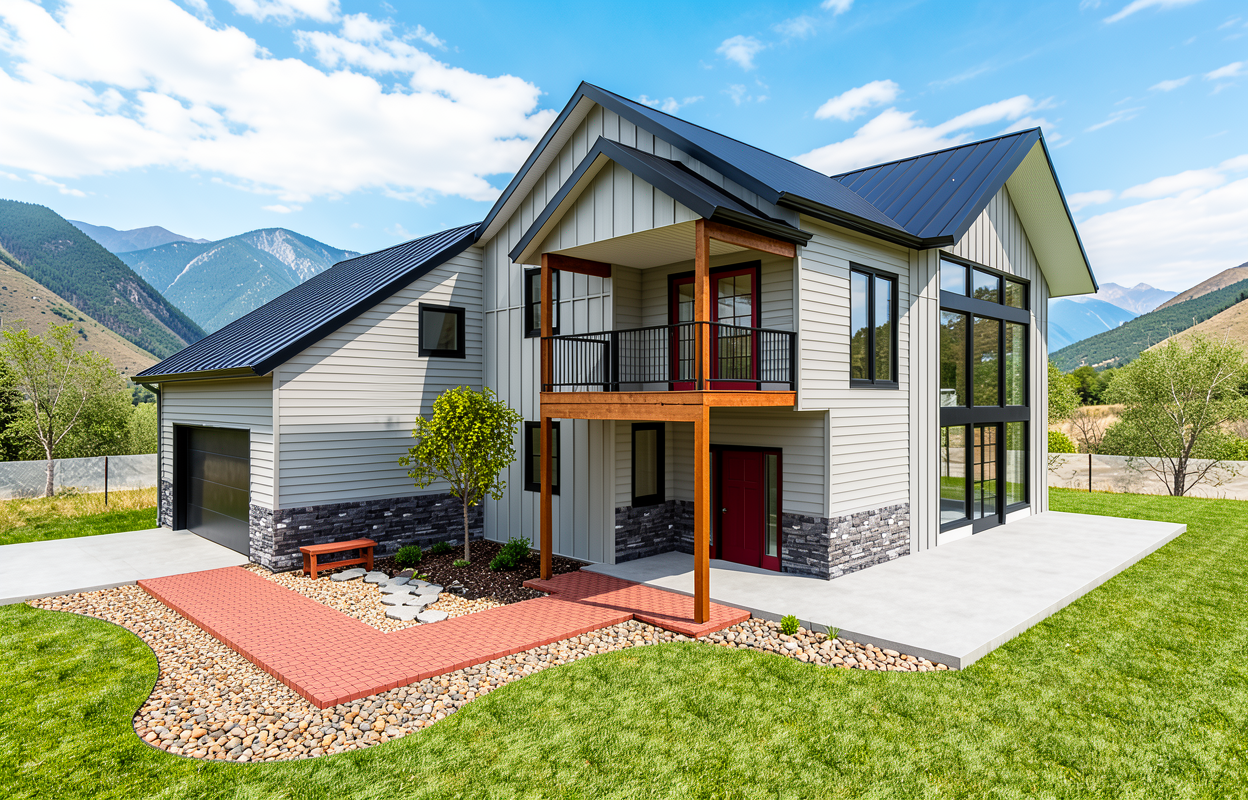 photorealistic rendering of home with low distant tree covered mountains in the background maintain colors from source image