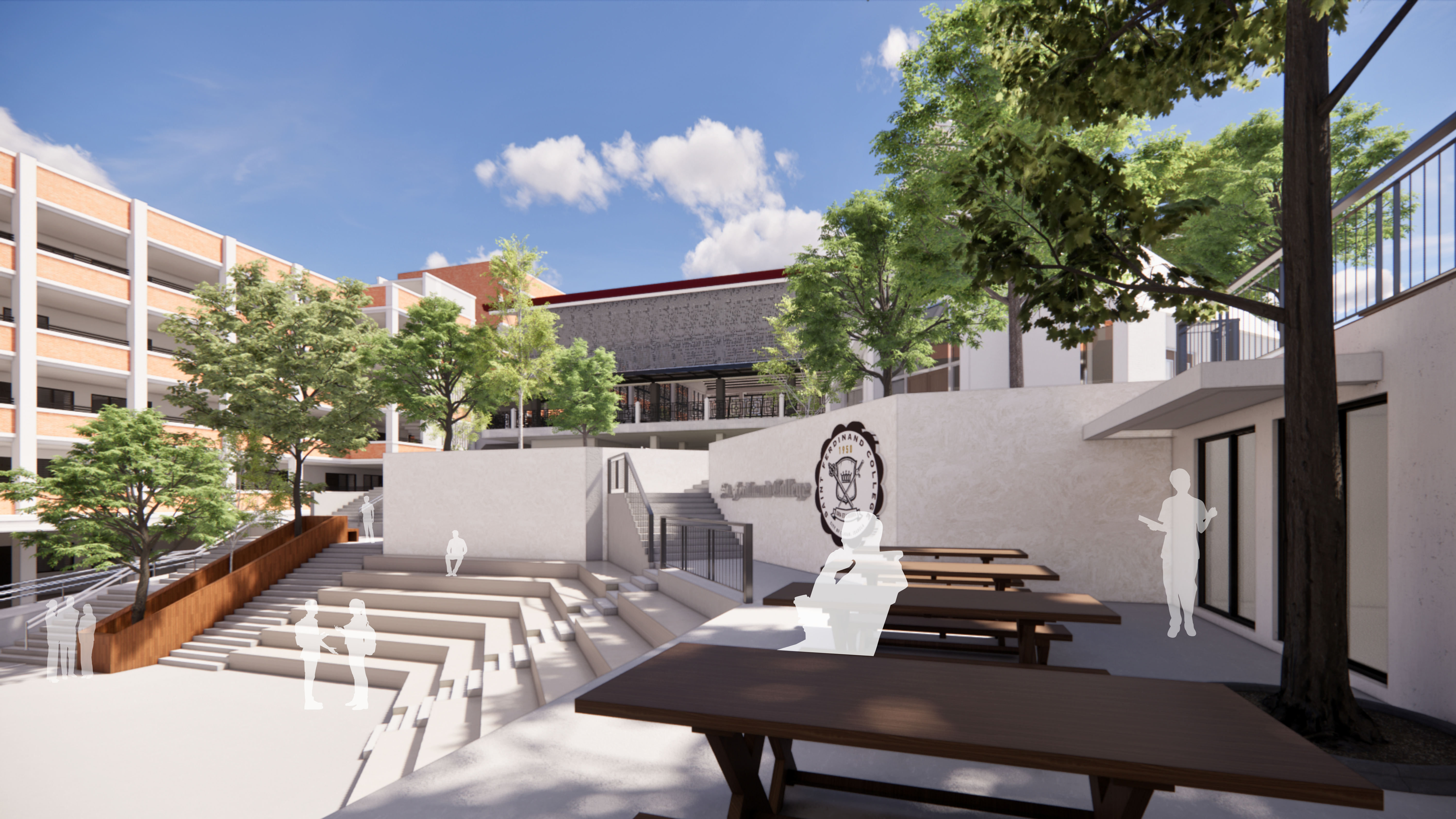 add wooden seating pad on ampitheater add paver blocks on lower floor add people snacking on existing table