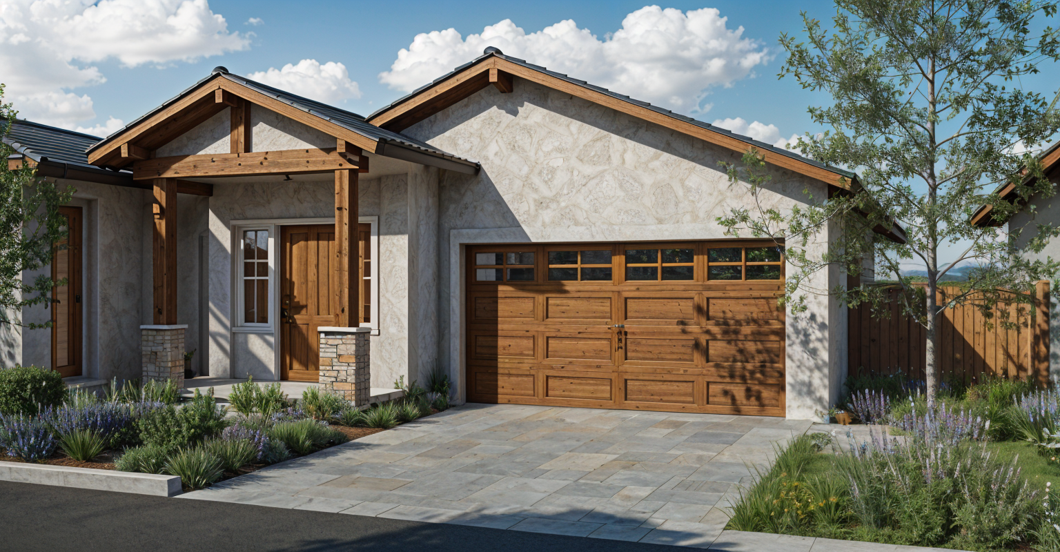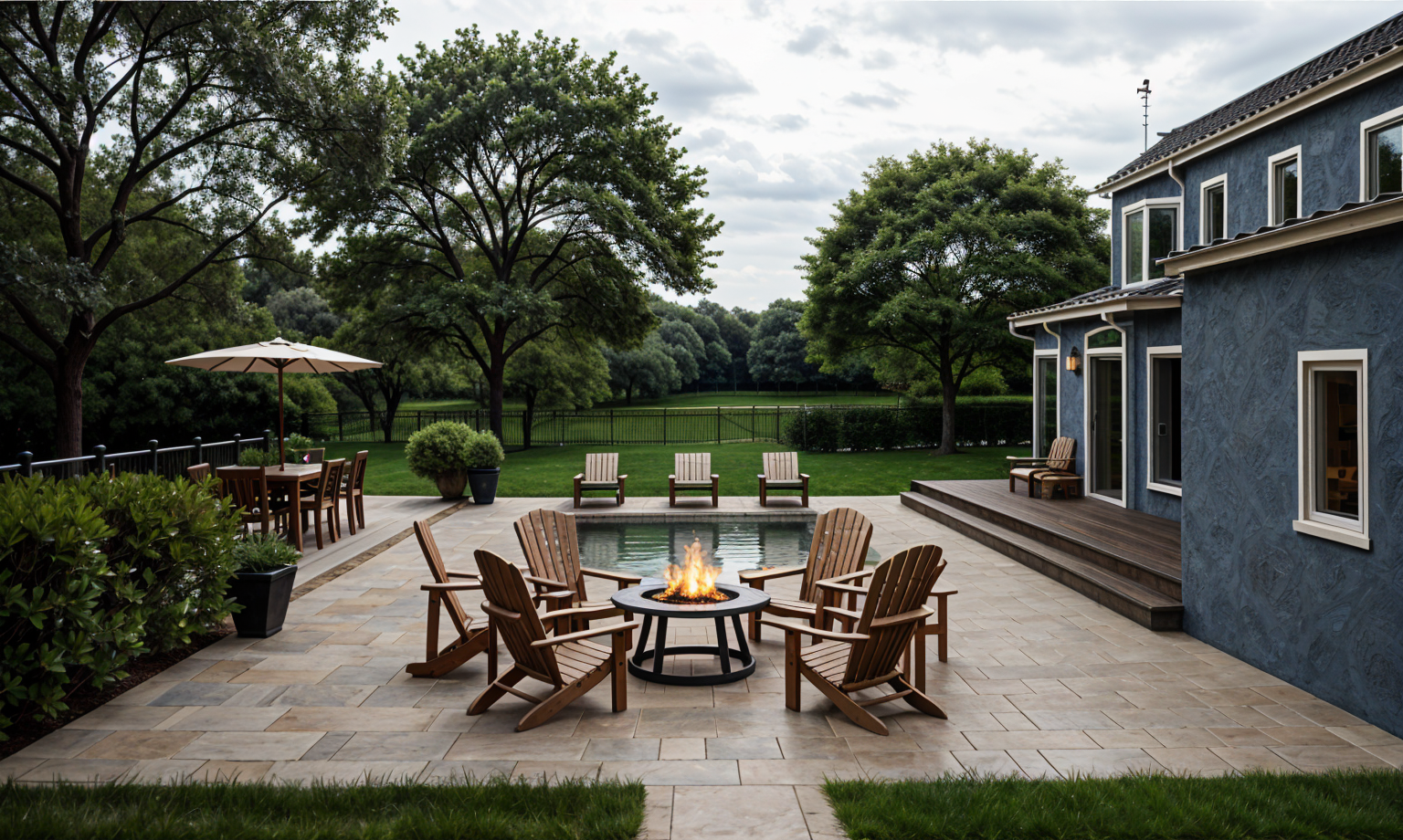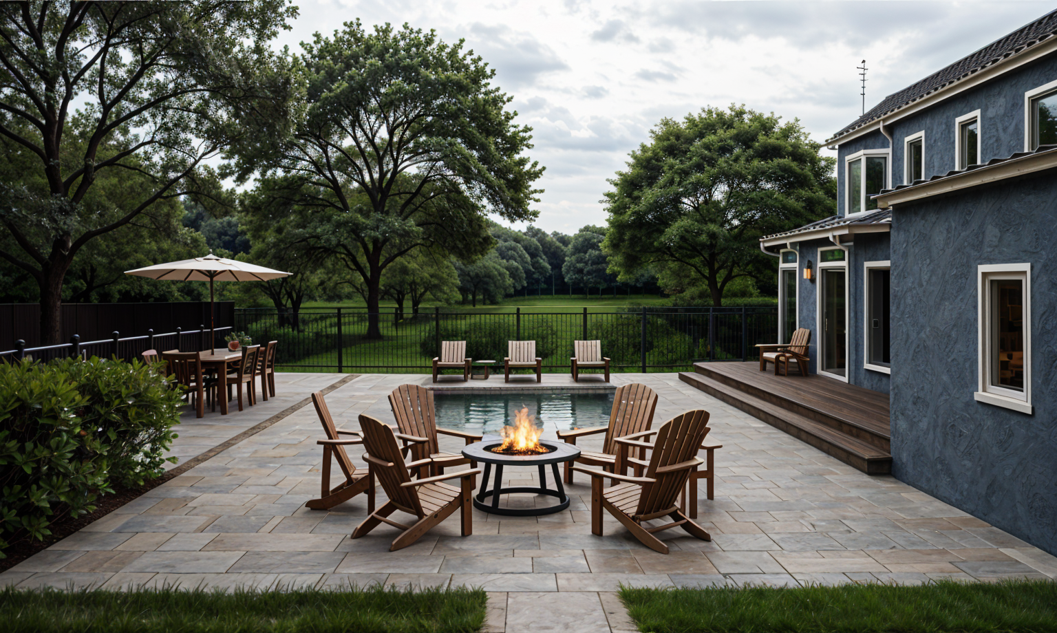 lush tree background light tile patio black fence in background wood deck step up on left black fence