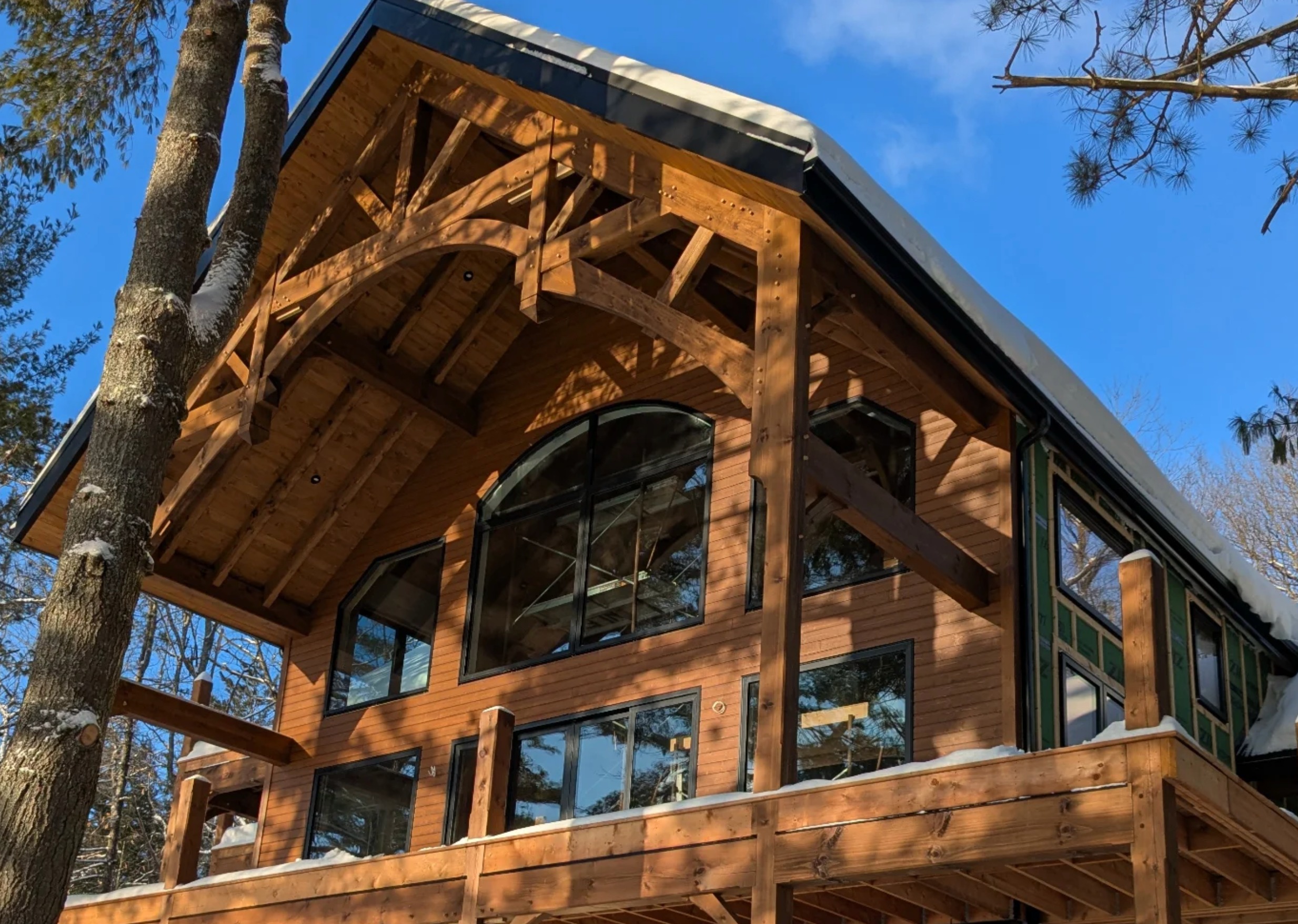 change the siding of this building into a dark vertical panel siding darken the stain of the timbers finish the railing with balausters and top rail on the deck