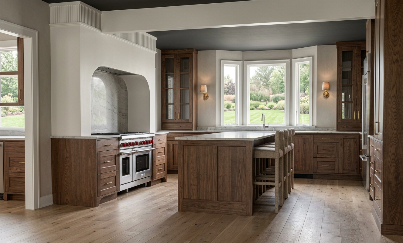ultra realistic kitchen rendering based on a sketchup model realistic cabinetry materials sw white flour painted range hood all other cabinetry in a dark walnut stain including the bar in the adjoining dining room crystallo quartzite countertops with subtle veining accurate texture scale white oak floors with subtle wear and color variation matte white painted walls and ceiling with slight texture single beam in the kitchen realistic fabric upholstery with visible weave rectangle windows overlooking a spacious yard physically accurate reflections and shadows soft indirect light global illumination professional interior photography crisp edges high detail clean modern aesthetic full frame camera 28mm lens