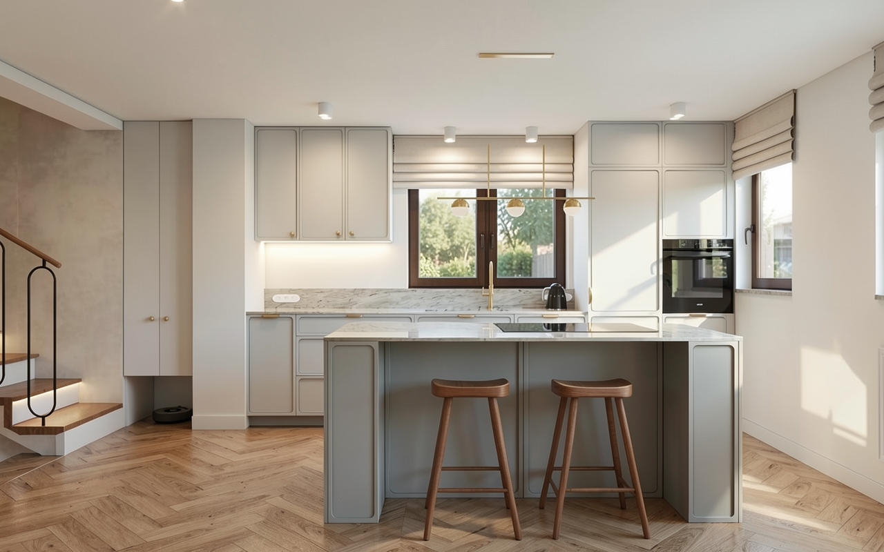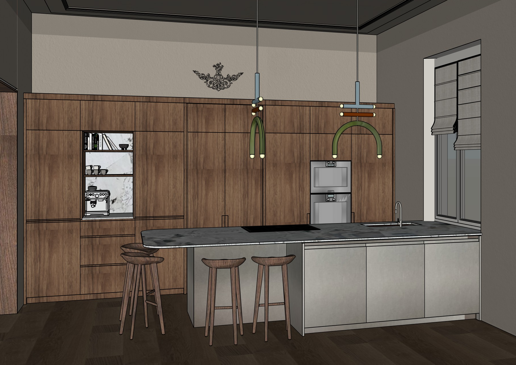 the walls should be lightly plastered and a little brighter the cabinets of the kitchen island are in stainless steel