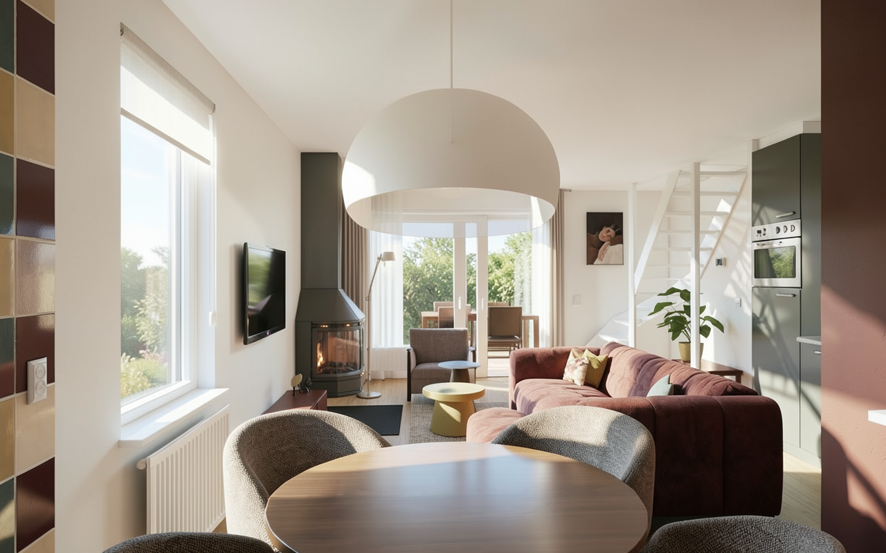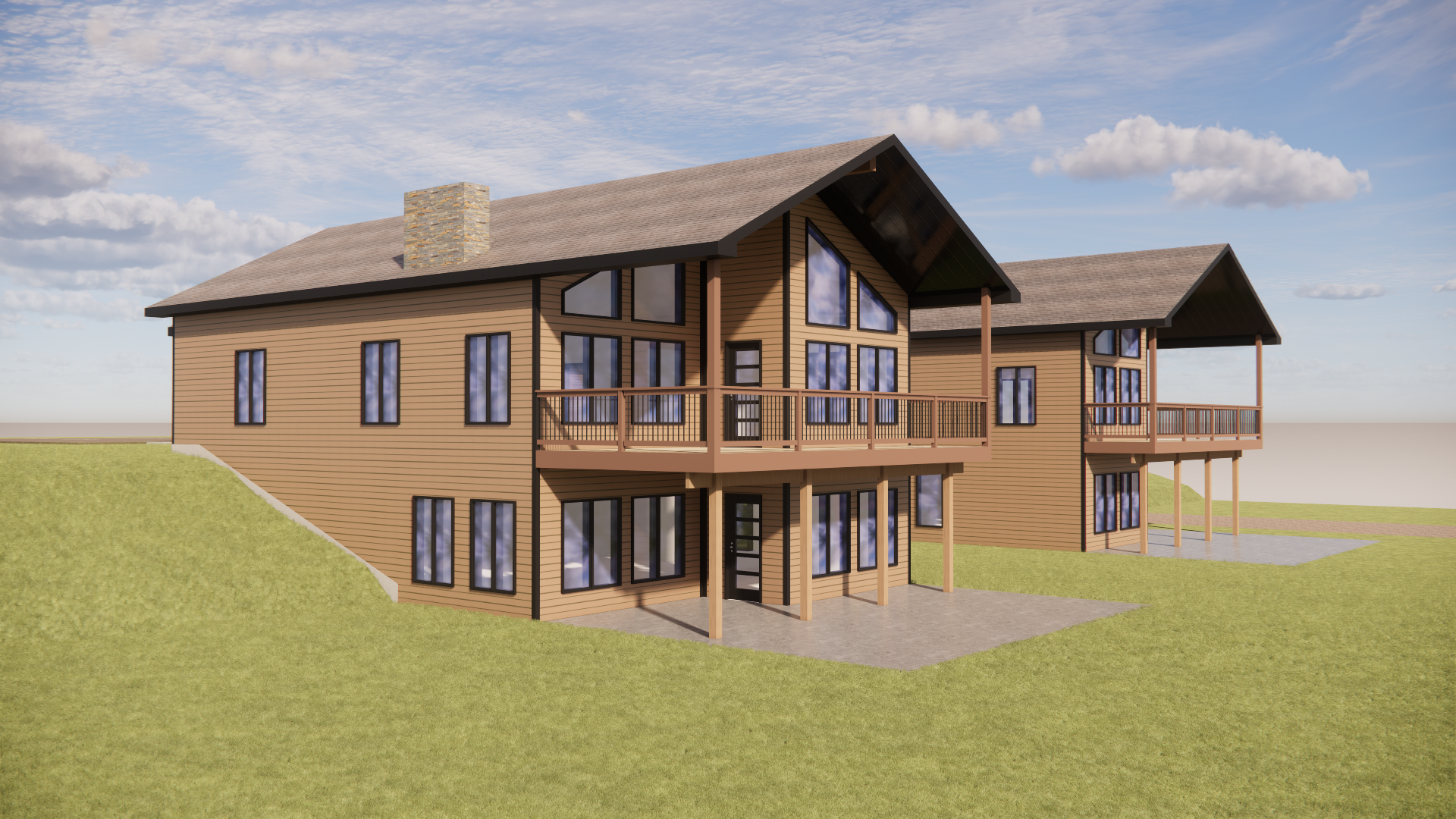 matching vacation rental houses keep the windows doors deck everything the same as it shows don t change anything about the buildings dark brown architectural shingle roofing black trim around the roof windows and doors stone chimney cedar colored 5 horizontal vinyl siding built into a hill with a gravel driveway green grass lawn with a stamped concrete patio with a firepit and chairs below surrounded by trees in the middle of a woods and bright sunny day