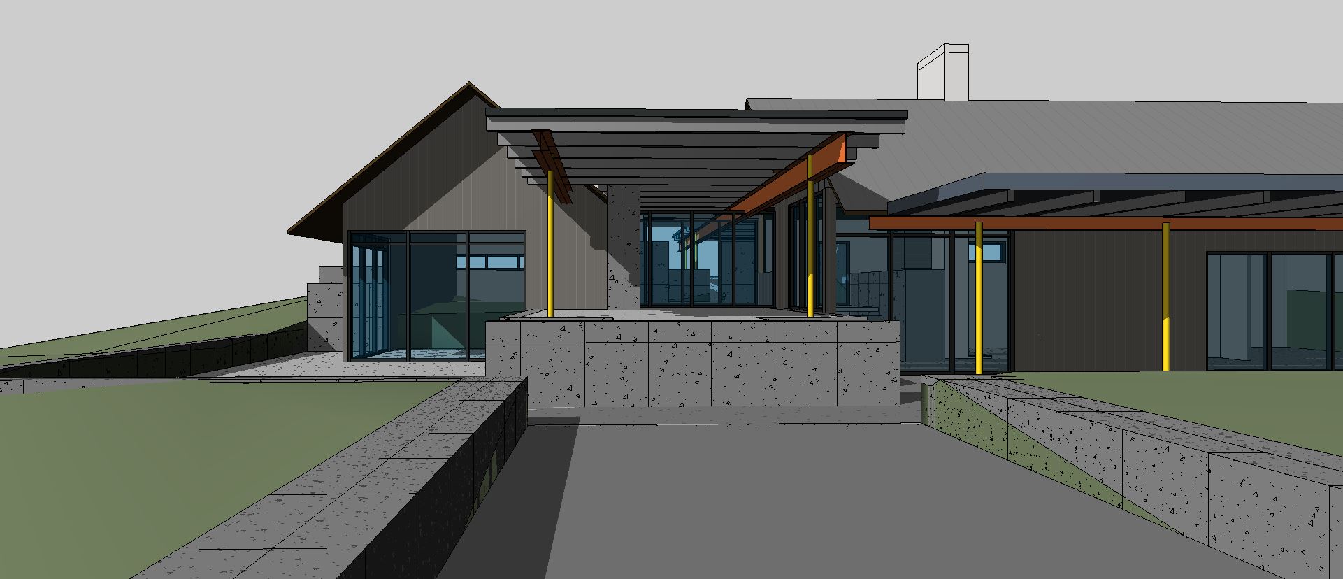 corten steel panels rustic wood shiplap siding concrete accent walls sunlight on building face tall grass in foreground fog trees in background interior lighting