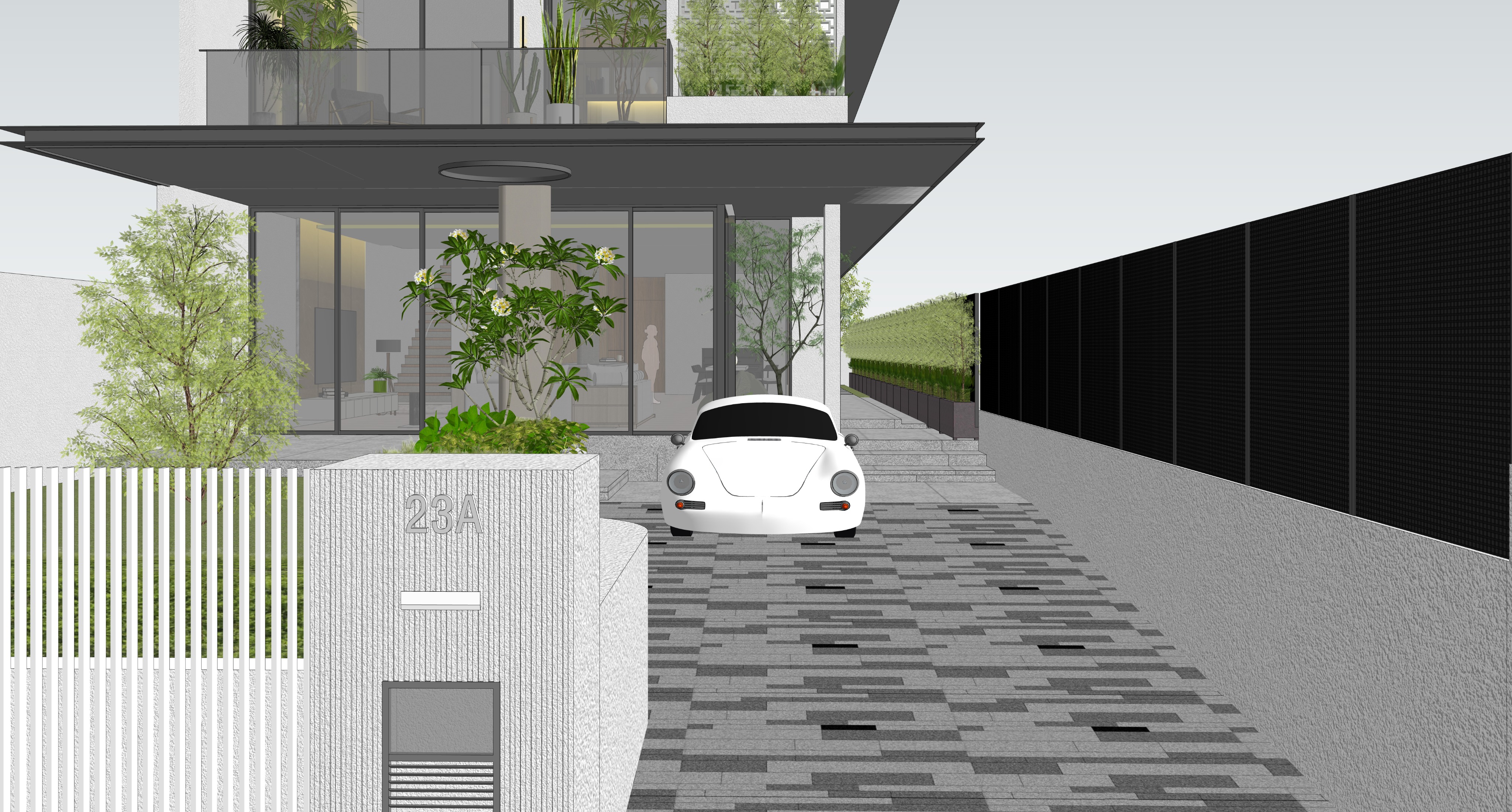 add asian woman at car porch black side wall with square perforation