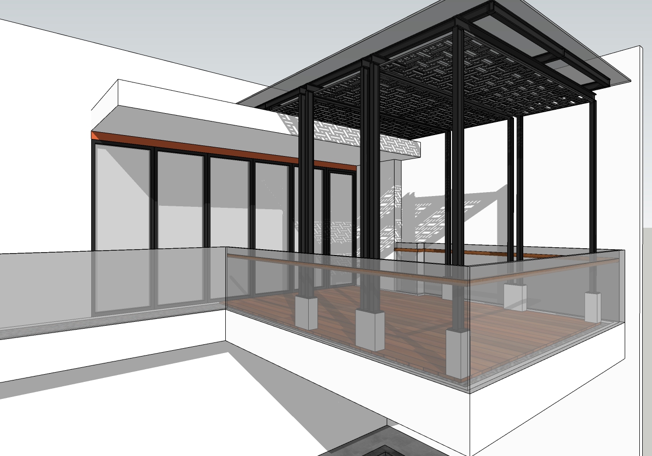 modernist exterior shot modern architectural terrace with sleek metal roof supported by black columns glass railings surround the area for a clear view warm wooden floors complement the minimalistic setting the atmosphere is tranquil and airy soft sunlight casts intricate shadows through the patterned roof enhancing the contemporary ambience white walls add to the spacious feel vibrant green plants serve as accents adding a touch of nature architecture