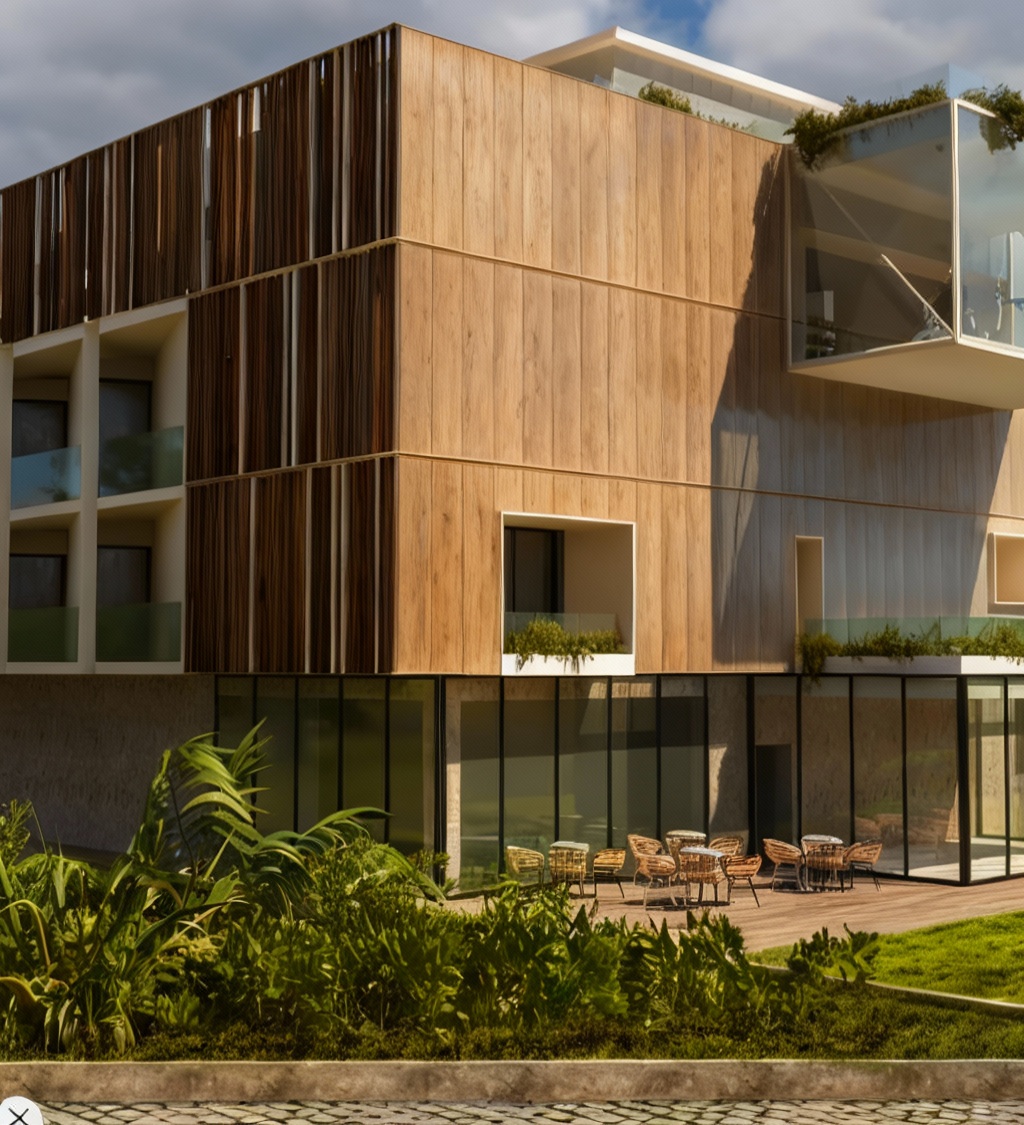 modernist interior shot modern coworking makerspace people working light colors robot arm serving coffee wooden accents warm morning light ambience architecture