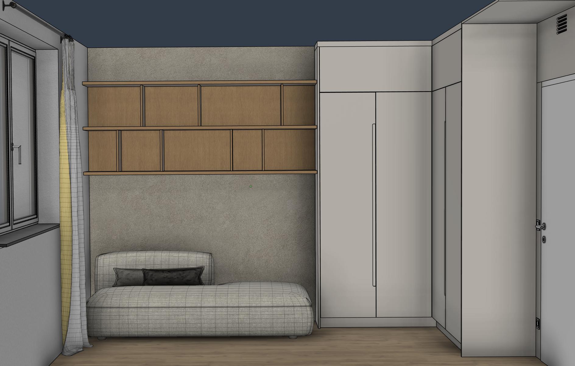 use the provided screenshot strictly as the base image do not change the camera angle perspective room geometry layout furniture placement or proportions preserve the exact composition of the reference image do not add new furniture or change the architecture only improve materials lighting colors and realism create a highly realistic interior render of a calm modern minimal bedroom corner furniture and materials must follow the reference exactly the sofa is a light grey upholstered sofa with soft rounded edges and visible fabric texture the upholstery should look like woven textile with subtle structure place two darker grey cushions on the sofa as in the reference the wall behind the sofa is finished with concrete plaster betonov st rka the surface should have a fine mineral texture with soft tonal variation and a natural matte finish above the sofa there are floating wall shelves made from natural oak wood the oak should have a subtle calm grain with a soft radial pattern not strongly contrasted the floor is natural oak wooden flooring with a matte finish and soft natural grain on the right side there are tall built in cabinets in a chalk colored matte finish soft off white chalk tone the surface should be smooth and minimal the curtain near the window is white fabric light and slightly translucent with natural folds the door on the right side is clean bright white with a smooth painted surface the light switches and wall outlets are also bright white minimal modern design lighting use soft natural daylight entering from the window on the left side the light should create a calm atmosphere with soft shadows and realistic reflections on the wood floor and cabinets style photorealistic interior visualization modern minimal design scandinavian aesthetic soft daylight realistic materials high detail textures