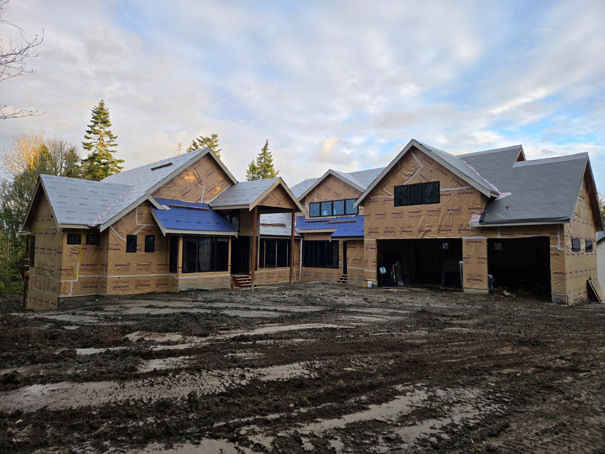 black glass garage doors dark walnut front door stonework accents along the bottom and the porch of the house but also going up the wall of the first garage stone poles on the front porch paver driveway beige siding for the first floor and vertical panels for the second floors with a thick divider gables in a dark bronze color roof black