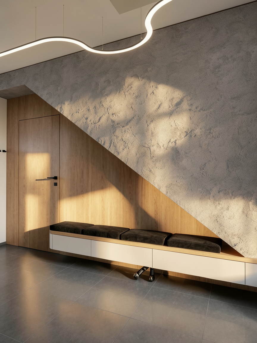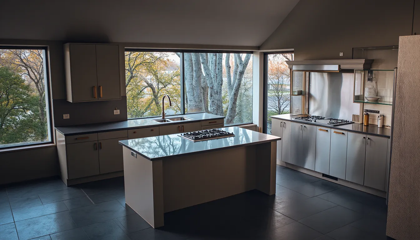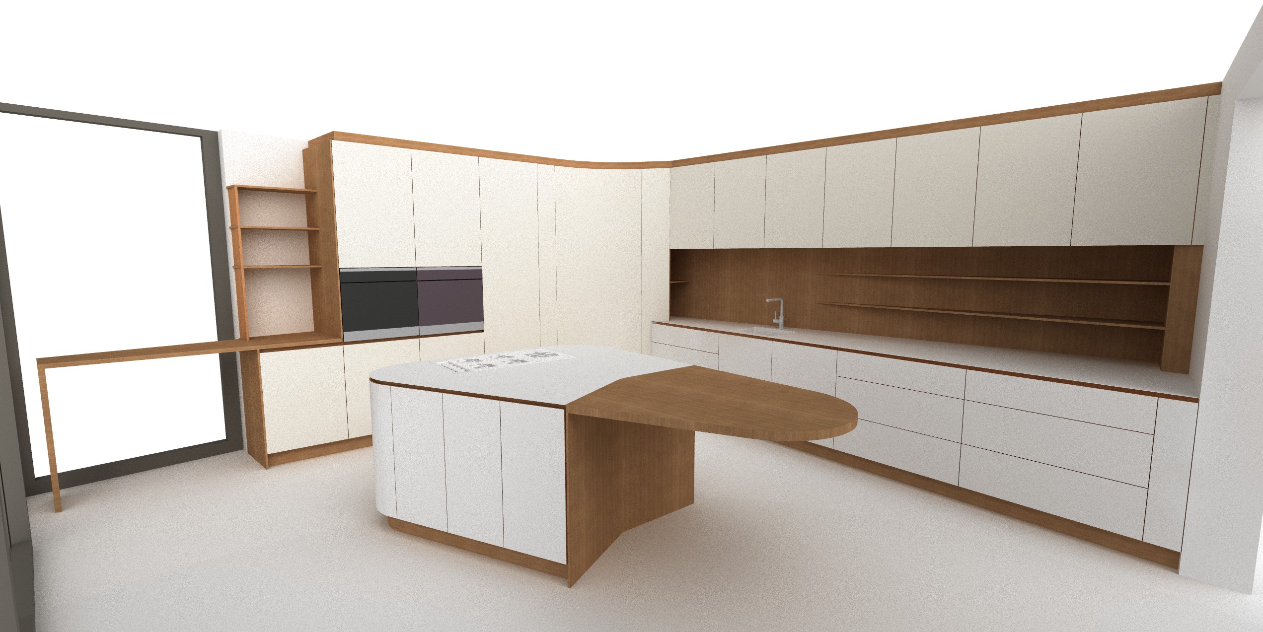 photorealistic rendering strictly based on the provided image do not modify the layout proportions number of columns or furniture shapes preserve the exact design of the furniture shelves and appliances respect the full height arched door in the corner without adding lines keep the original thickness of the materials especially under the countertop improvements refined terrazzo floor simplified and elegant garden view through the existing opening natural light discreet ceiling spotlights two well positioned wooden stools on the wooden extension of the island facing each other high end coffee machine on the left countertop fruit bowl on the wooden extension of the island accessories on the small shelves to the right pots spices plants no fruit bowl in front of the window replace the cooktop on the island keep the two ovens do not modify the shelf design near the window style high end villa ambiance warm and elegant no reinterpretation absolute fidelity to the original design architecture