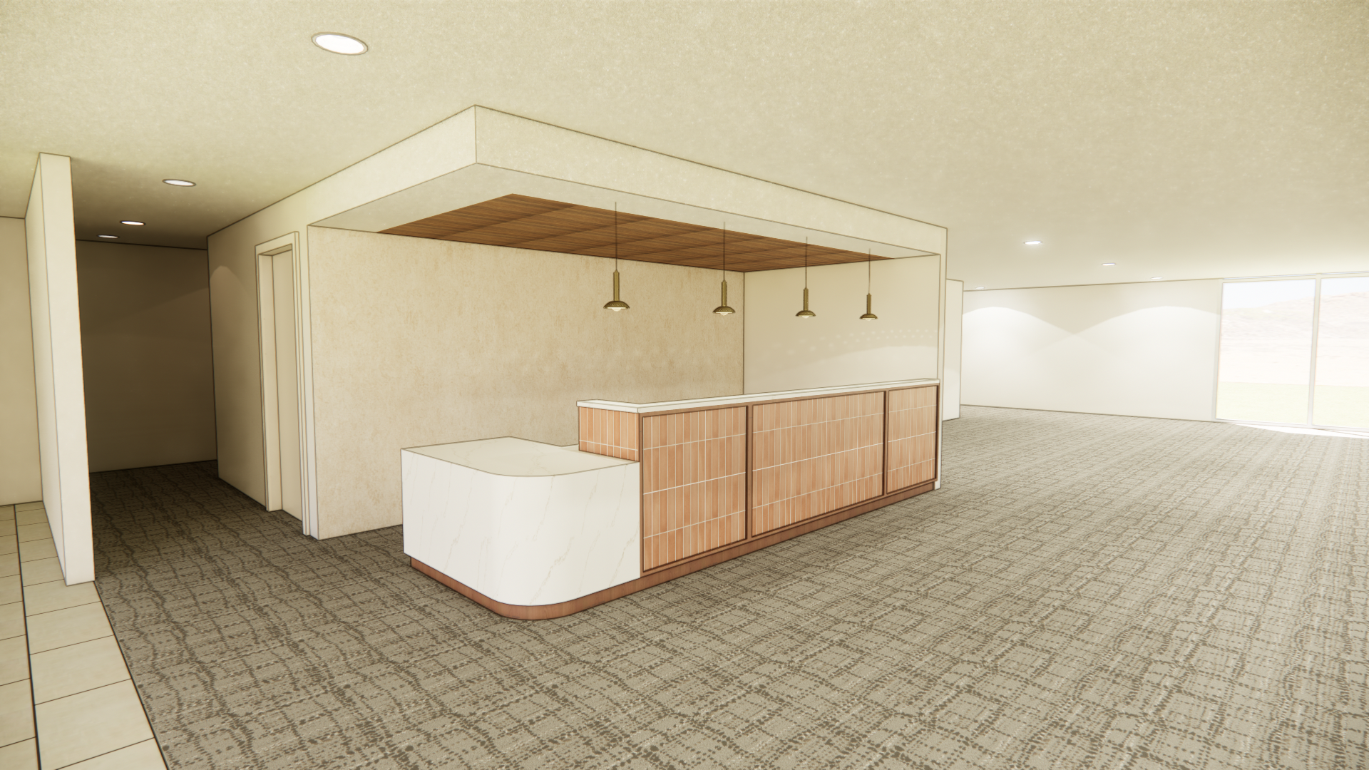 stage this as a reception desk lobby add a plant on the desk and a person do not make the floor glossy it is carpet