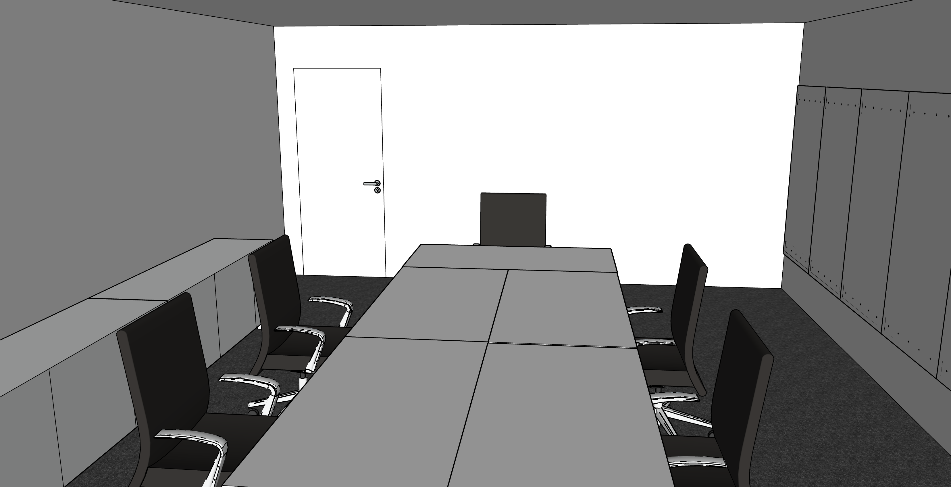 lighting is soft warm and even the table tops are white the white boards are white glass with coding written on it the make right and left walls white the console is a white lacquer the chairs are leather with chrome arms and legs