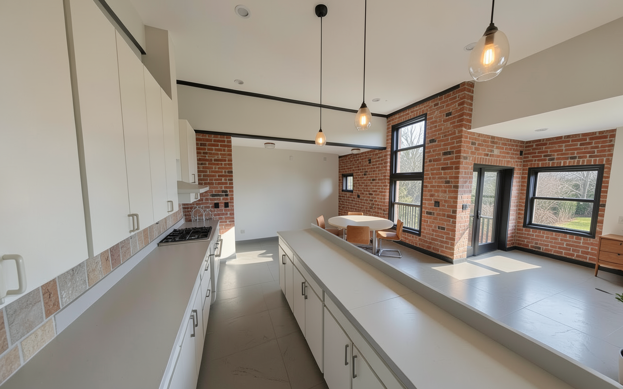 ultra photorealistic interior architectural render of an industrial modern caf important maintain the exact existing floor plan layout proportions ceiling height walls openings and circulation no structural spatial or layout changes material enhancements industrial modern exposed concrete walls and ceilings with subtle texture and natural imperfections blackened steel beams columns trims and railings with matte or satin finish warm natural wood accents oak or walnut used on counters shelving wall panels and table surfaces polished concrete or large format matte stone flooring minimal color palette charcoal black warm wood tones soft gray furniture caf elements do not change placement logic custom minimalist black metal caf furniture with solid wood tops mix of seating communal tables bar seating at counters small two and four person caf tables upholstery in leather or dark fabric camel brown charcoal or black built in power outlets and usb ports discreetly integrated into tables and counters industrial style shelving with clean lines lighting atmosphere matte black or brushed brass industrial pendant lights above tables and counters warm ambient lighting balanced with soft natural daylight subtle indirect lighting highlighting concrete textures and steel elements cozy yet energetic mood suitable for studying socializing and long stays details styling refined not cluttered minimal graphic branding and brushed metal signage curated d cor books ceramic pieces coffee equipment subtle greenery potted plants and hanging plants to soften the industrial tones clean uncluttered surfaces with intentional styling render quality camera ultra realistic lighting and global illumination high resolution photoreal textures eye level interior perspective cinematic depth of field natural color grading professional architectural visualization quality