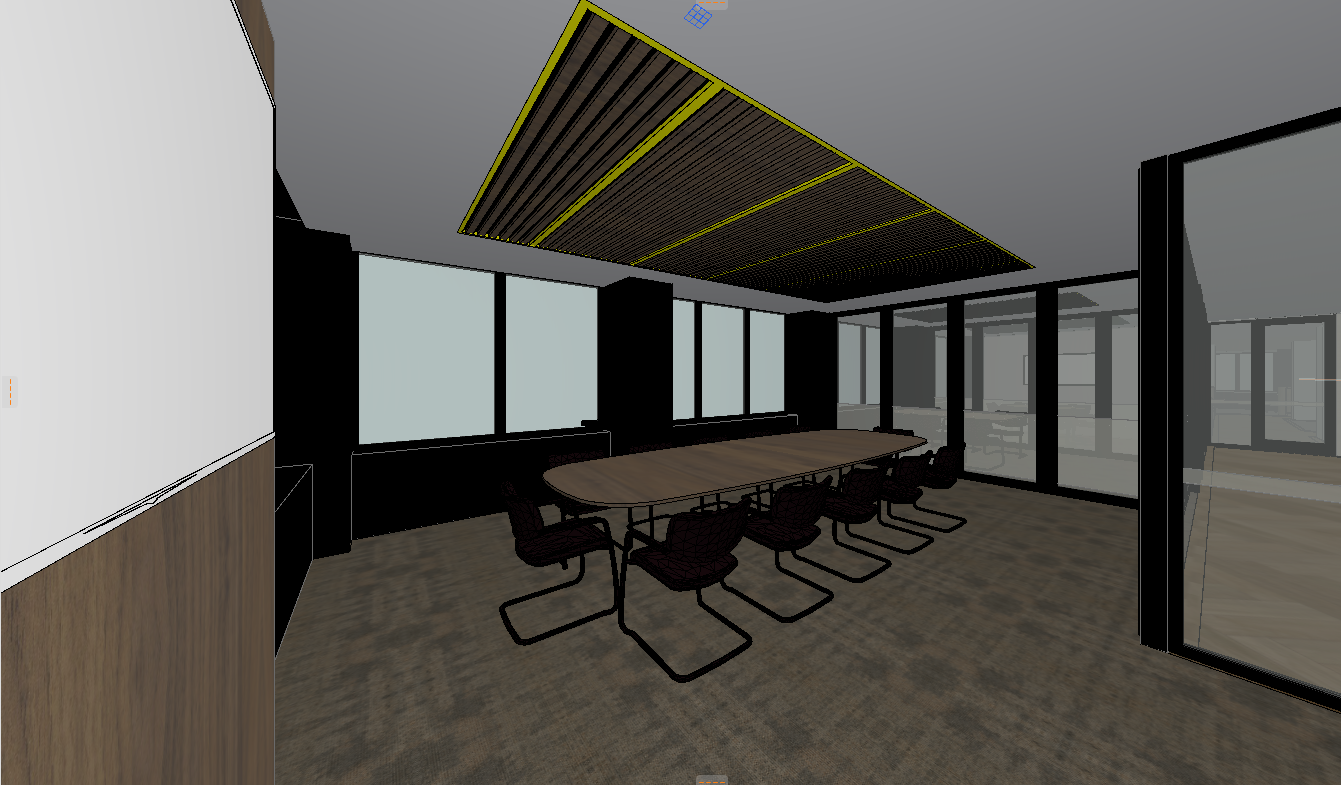 make this a realistic interior office render this is a view taken from the boardroom there is a television on the left in place of the white panel the ceiling finish is an acoustic timber ceiling feature with leds between the panels