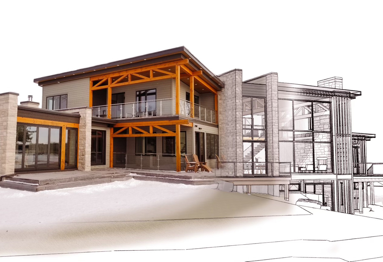 a modern mansion with a beige facade accented by natural wooden beams in a rich warm orange the house has large glass windows that reflect a clear blue sky surround it with a serene atmosphere using earthy tones for the deck stones in soft grays and crisp white snow on the ground the scene should evoke a peaceful elegant ambiance highlighting the blend of modern architecture and nature