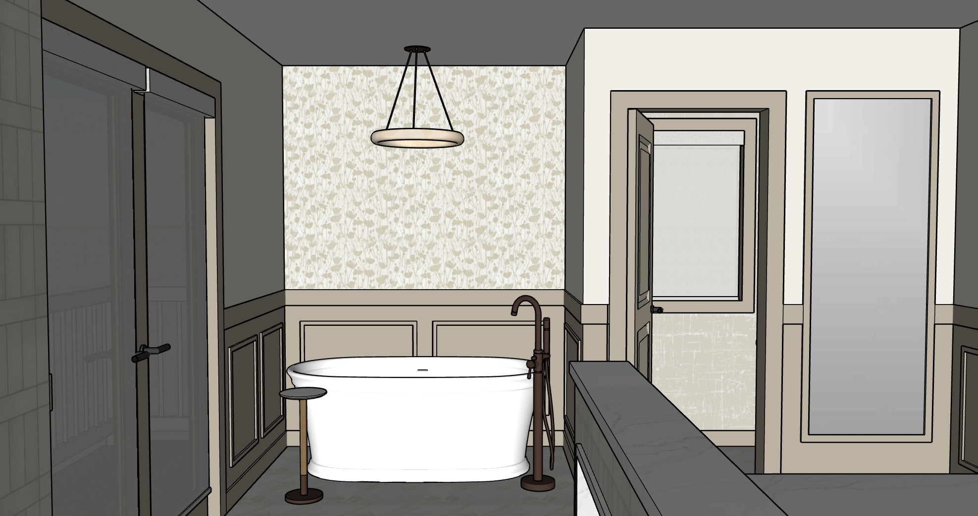 make this photorealistic the floor is by tilebar calacatta oro white 3x12 polished laid in a herringbone pattern plumbing and hardware are champagne bronze finish the molding casings and doors are benjamin moore pashmina the walls above are benjamin moore alabaster use natural lighting and soft shadows the wallpaper inside of the watercloset is azeri dn2 azi 01 origami the windows have an off white light filtering roller shade and greenery in the background next to the door opening is a flush full length mirror framed in the same pashmina color reflecting a white oak vanity with a 3 inch thick countertop with a 6 inch reeded detail at the top gold arched mirror flanked by sconces on either side with a white shade and an arcylic stem with gold wallpaper over the tub is shimmering poppies white and gold by york wallcoverings the poppies are foil and reflect the light in a beautiful way the chandelier over the tub is made of alabaster the side table by the tub has a gold base wood leg and marble top no crown molding and white ceiling