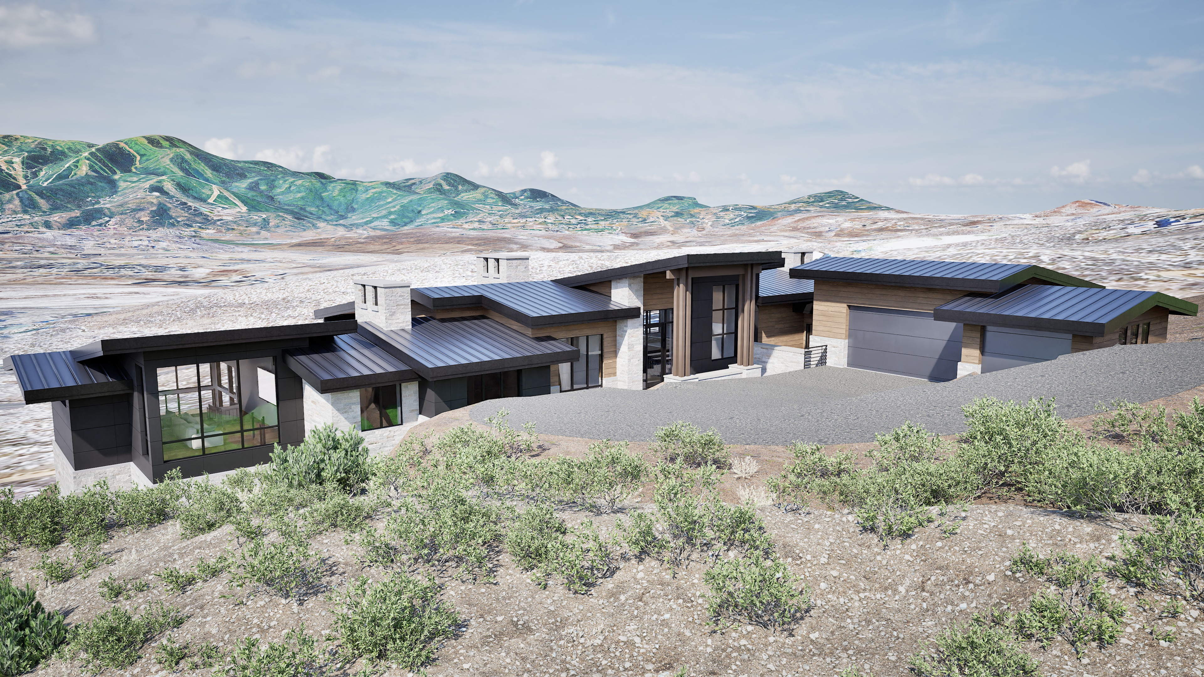 don t change the structure a mountain modern home with the these materials brown horizontal wood siding white dry stacked natural stone dark gray aluminum panels and a dark gray copper roof paneling add vegetation around the driveway to add color enhance the lighting and shadows to be more realistic make the background feel more realistic but don t change the structure of the terrain just add trees and dirt change the sky to be more blue and have fluffy clouds make the tectures of the roof and plants hyper realistic by adding ridge lines to the roof drain spouts on the side of the house etc
