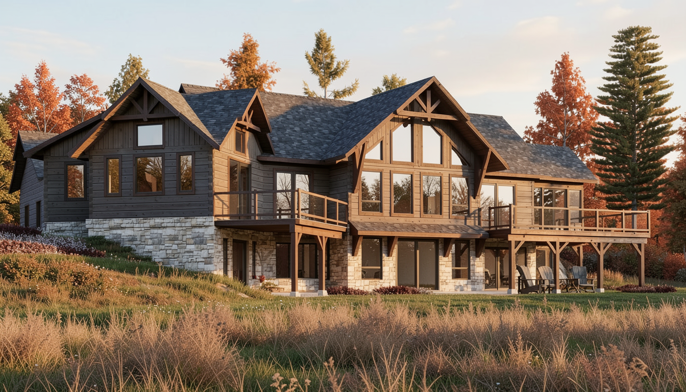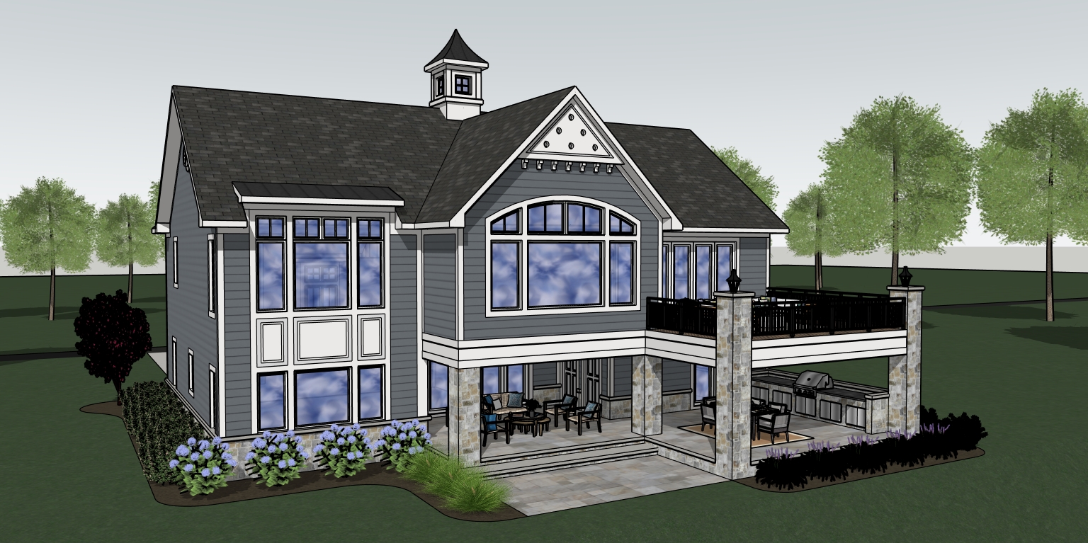 partly cloudy sky gray blue siding white windows add gutters and downspouts make lake erie reflecting in window glass
