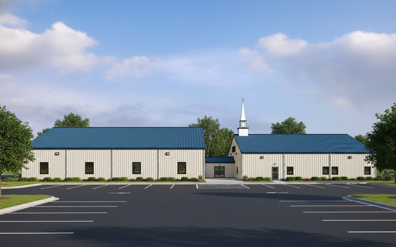 church building in parking lot blue metal roof cream metal siding 2 front side doors on each side and 2 windows only on the front