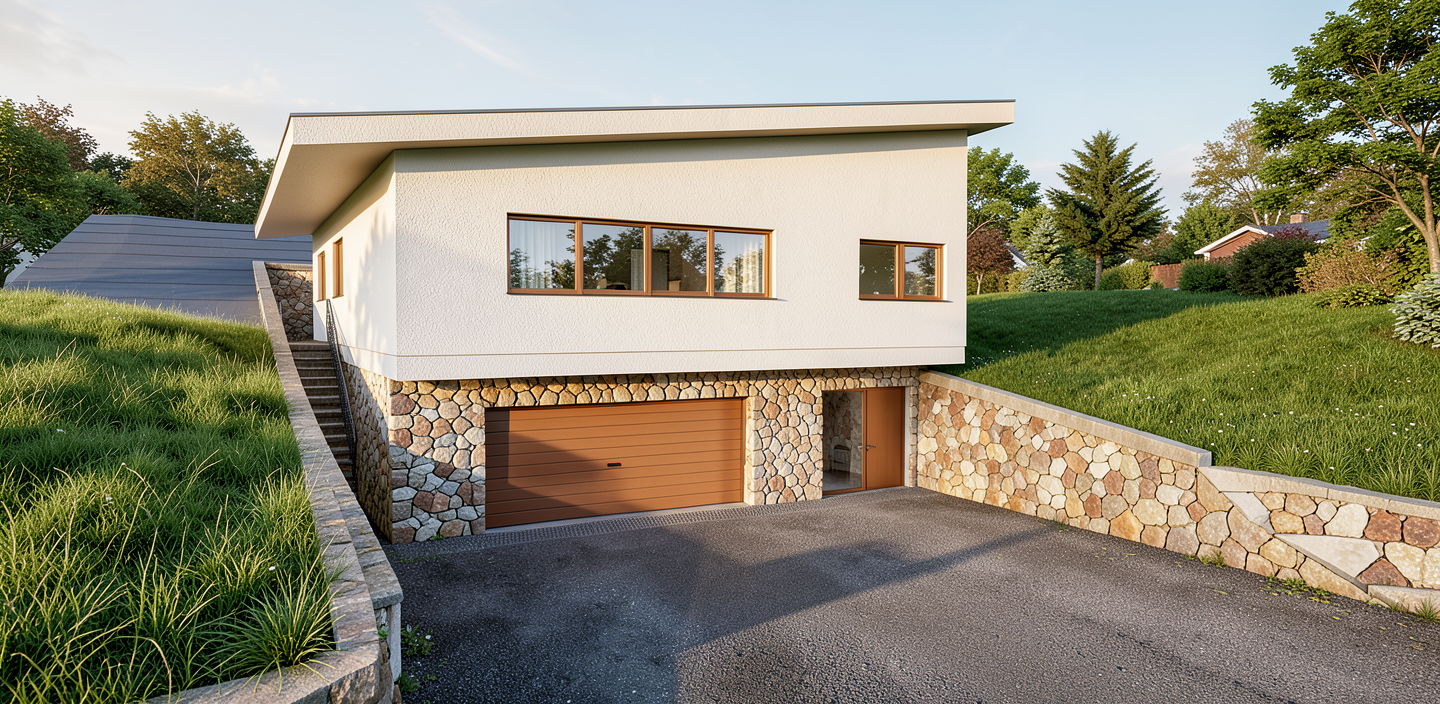 okolo rodinn ho domu je svah s tr vnikom pred domom je pr jazdov cesta medzi m rmi vo svahu je len trava spodna cast fasady bude oblozena umelym obkladom sedo hnedym strecha tmavohneda