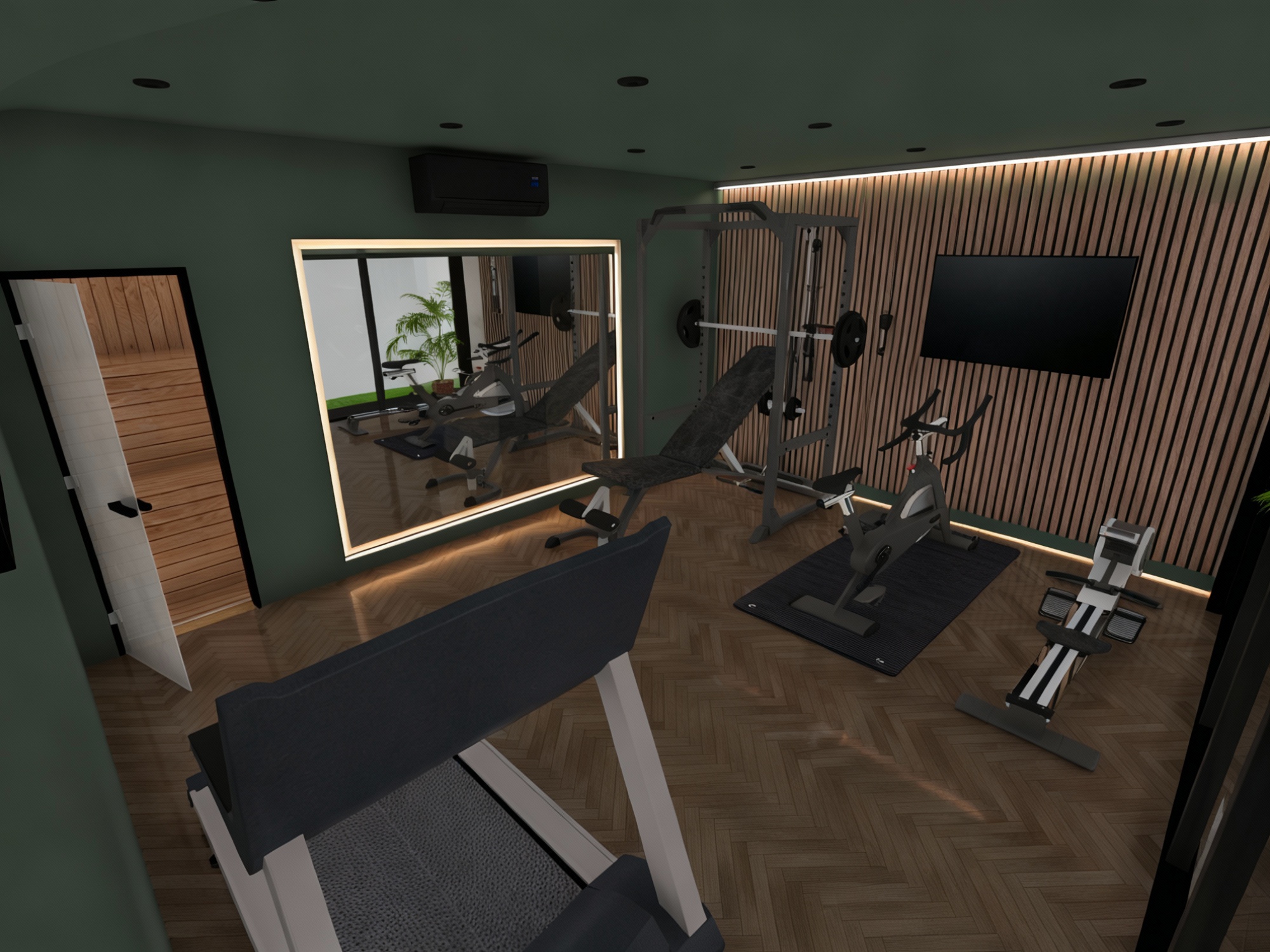 mirror do not omit mirror must have led lighting mirror must be surrounded on all four sides by a continuous warm white led strip mirror led strip must be recessed in an aluminium channel mirror led lighting is a required element and must be clearly visible walls ceiling ral 6009 fir green smooth ceiling higher at front sloping down to back no ceiling slats slatted feature wall only slatted element vertical timber slats only thin narrow slats geometry do not remove upper gap above slatted wall must exist and must be visible upper gap finish painted ral 6009 not timber upper gap size 30 mm at rear increasing to max 100 mm at front lower gap 100 mm above floor painted ral 6009 feature wall led lighting warm white led in recessed aluminium channel directly above slatted wall warm white led in recessed aluminium channel directly below slatted wall underside of slats not floor negative strict no slatted timber ceiling no timber in gaps no wide slats no led on floor do not remove mirror led lighting