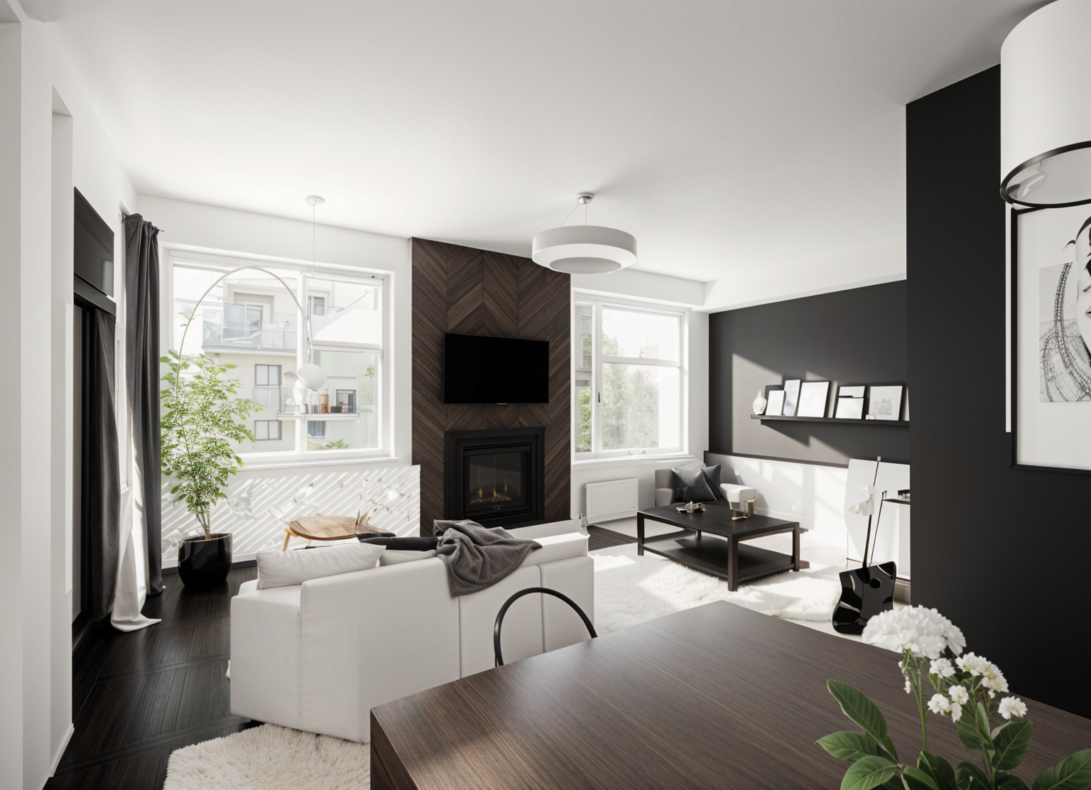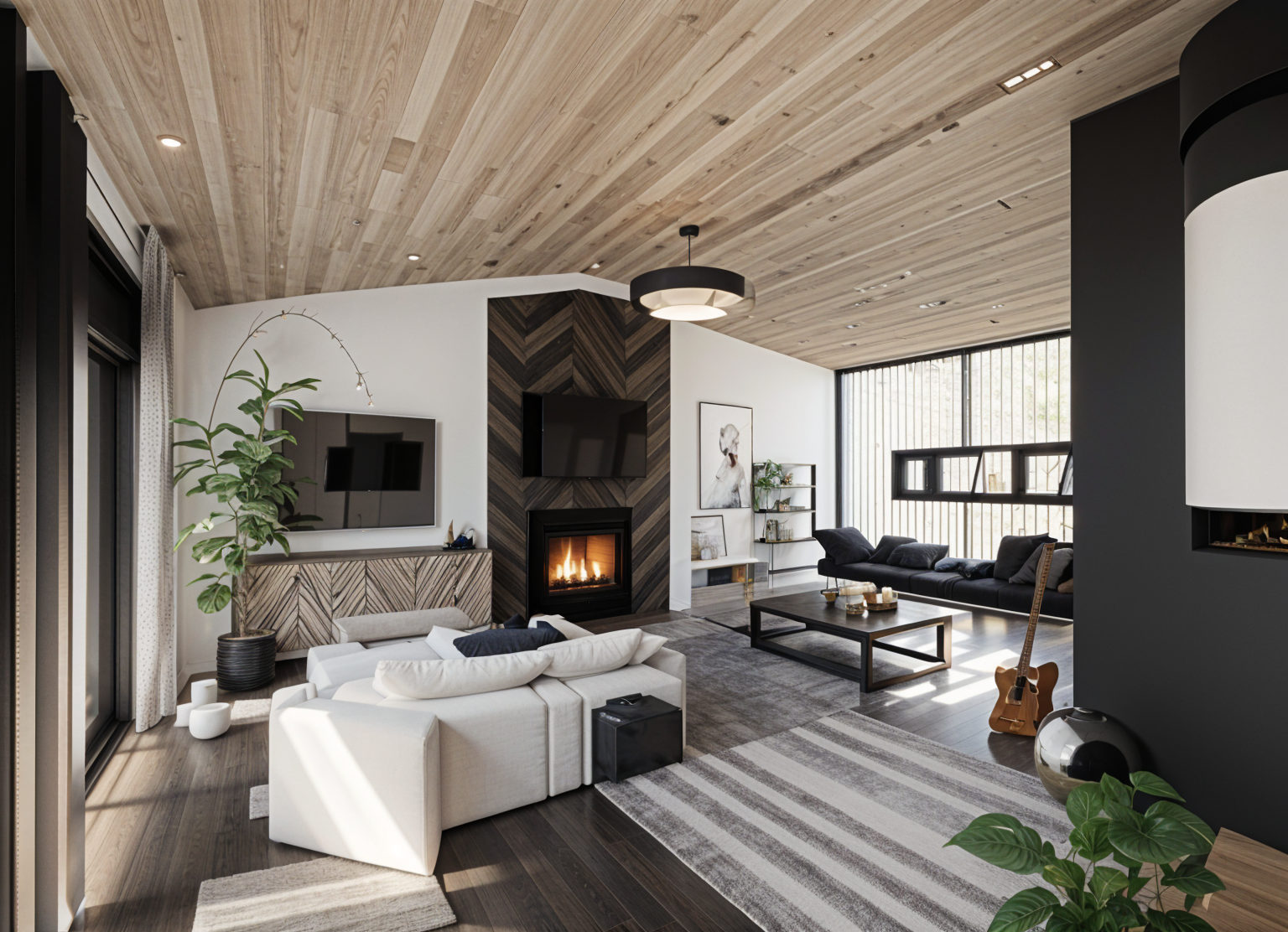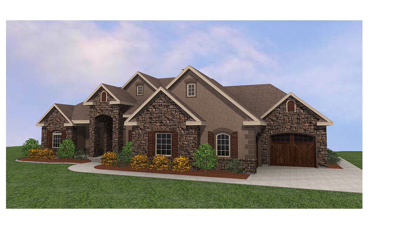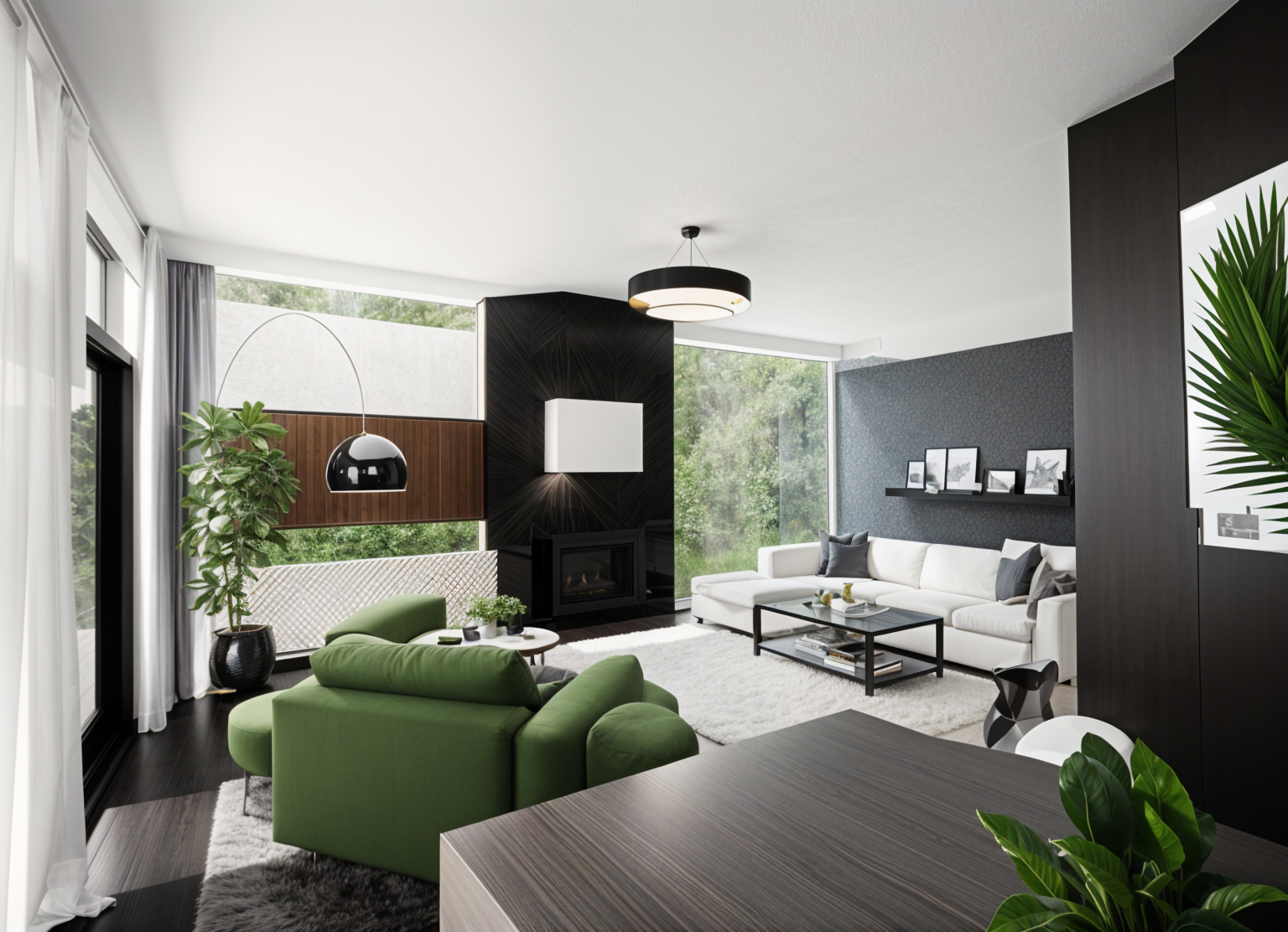 a modern house retain the exact structure colors and window arrangement rooflines siding foundation height and proportions exactly as shown in the reference image integrate into the terrain there are very few trees mixed hardwoods that are mostly on in the distance of the image add cooler afternoon sunlight subtle dappled highlights across the siding and grass create ultra realistic lighting crisp shadows detailed textures in the siding and glass reflections and an overcast sky show only a few lights visible inside render in hyper realistic architectural visualization quality 8k resolution add a driveway tying into the concrete garage door apron make it the summer season add realistic landscape