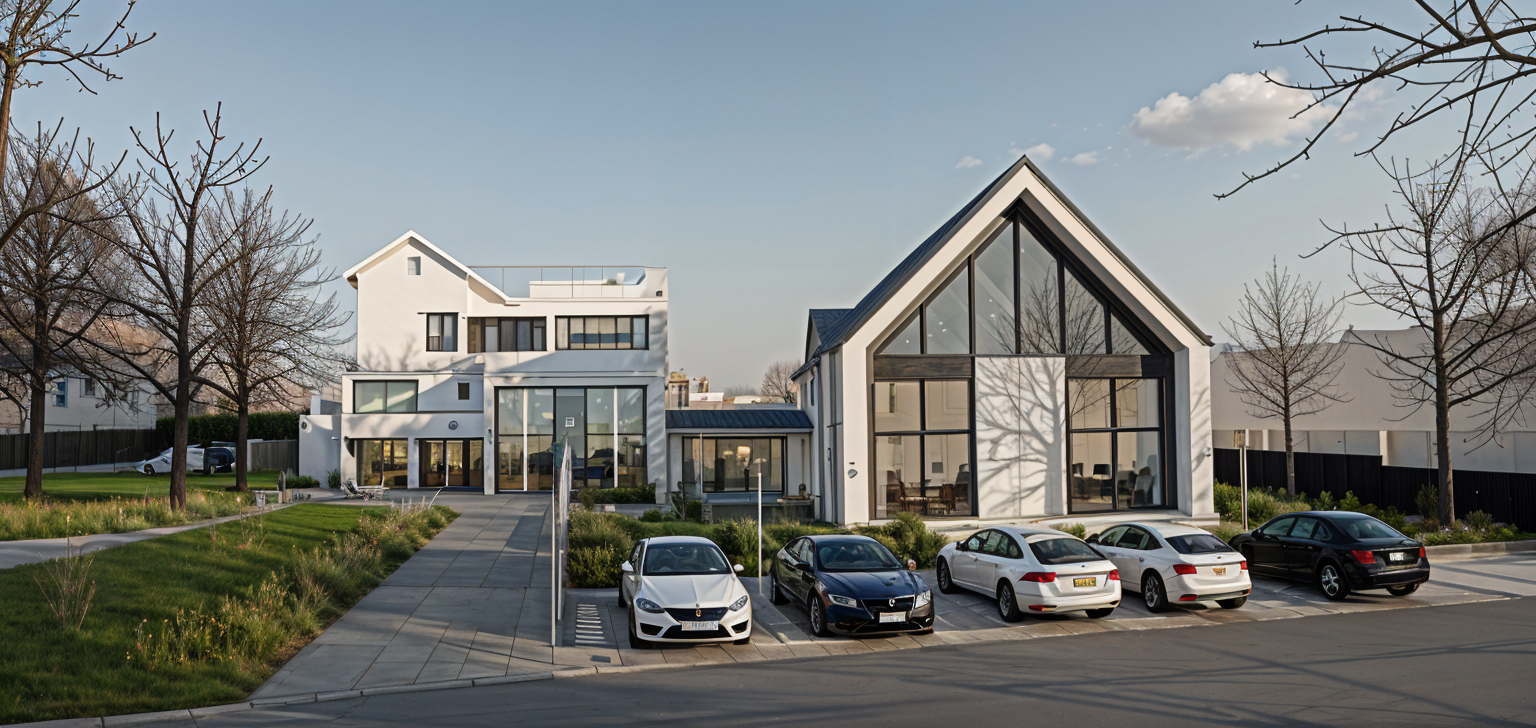 modernist exterior shot a beautifully rendered modern minimalist house set amidst a serene natural environment the house features angular wooden structures with a dark gray and black exterior large glass windows reflect the subtle hues of the surrounding landscape the wooden siding has warm earthy tones like soft browns and is combined with sleek contemporary black trimming the atmosphere is tranquil and the lighting is soft mimicking a gentle morning or late afternoon light the ground is adorned with patches of green moss and vivid yellow wildflowers adding a burst of color and life the surrounding trees are leafless drawn with delicate thin black lines indicating the late autumn season shadows of the trees create an intricate pattern on the house and the ground in varying shades of gray and brown the entire setting feels both modern and natural embracing simplicity and elegance architecture white facade keep windows from concept wood factory inside keep industrial metal door to building and keep windows pozitions this building is modern church inside is church put some cars to parking near building the left building white simple facade and keep building geometry
