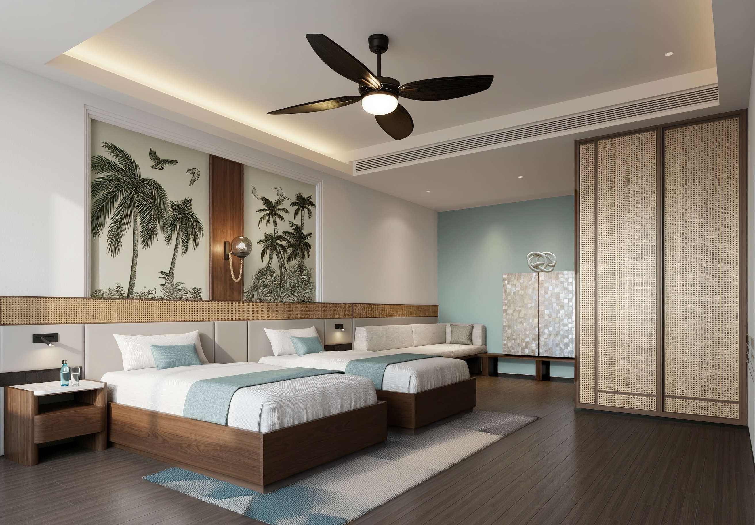 photorealistic render of a resort hotel room interior featuring two dark wood bed frame with crisp white linens and soft teal colour linen bed runners the walls are painted a soft calming white with a feature wall in a muted colour tropical wall covering for contrast a long natural tone wicker texture headboard with backlighting stretches the length of the room providing a warm atmosphere the floor is a dark wood tone complementing the rich wood of the beds and side tables the minimalist ceiling has a sleek modern design painted in a soft white ambient lighting is soft and inviting with a modern tinted glass sphere wall sconce with rope detail above and in between the beds a large wooden wardrobe with see through vertical slats doors stands elegantly to the side along with a contemporary minibar cabinet in mother of pearl mosaic finish in the centre of the ceiling is a black ceiling fan to add to the resort them the atmosphere is serene and calm exuding both comfort and style