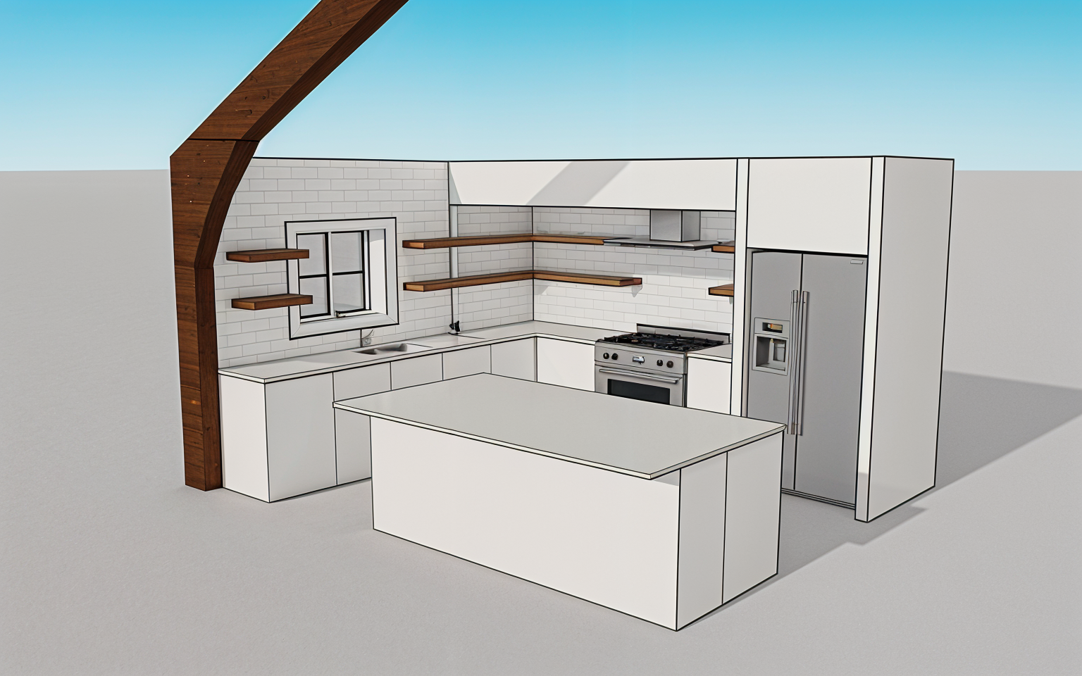 render this image in high quality with photo realism insert a sink and faucet below the window add shaker style cabinetry and remove the chimney style hood for a hood insert wrapped with trim