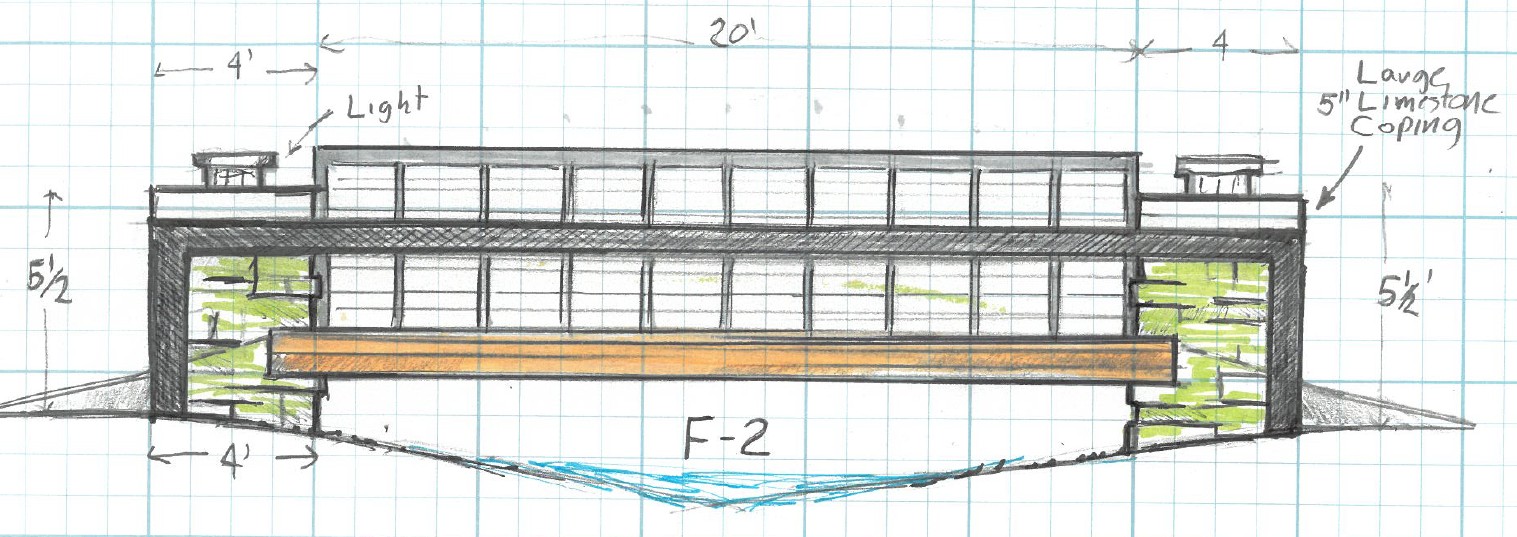 stone pillars with limestone coping on top black metal frame with black metal railing and lighter wood color floor show stream flowing underneath bridge