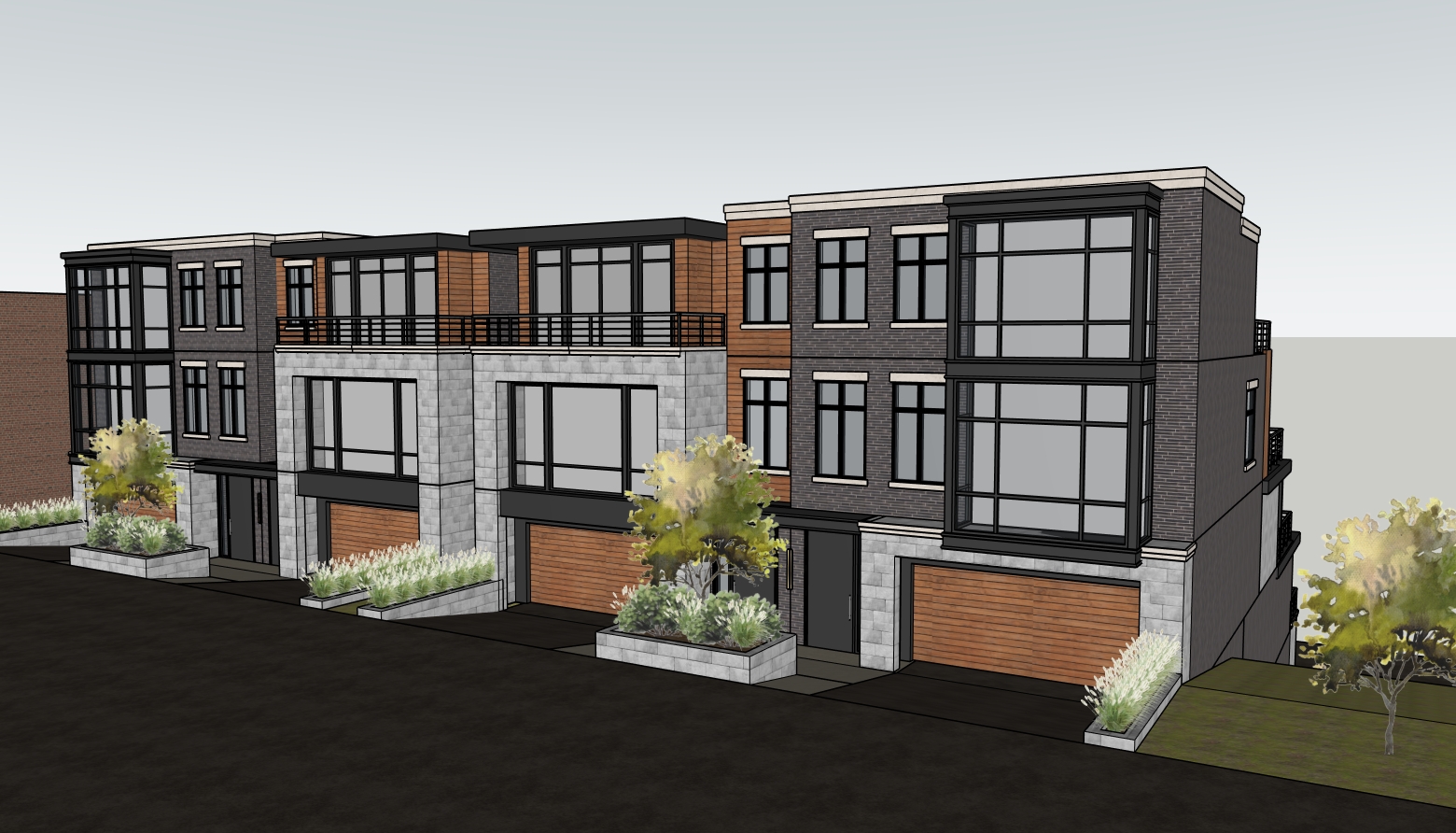 ultra photorealistic architectural rendering in a cinematic real time visualization style unreal engine d5 render quality late morning daylight with slightly angled sun creating soft defined shadows balanced exposure with no blown highlights low bloom and controlled dynamic range warm neutral color grading with subtle warm highlights and neutral shadows no blue tint natural material response with warm light reflecting off wood and ground surfaces slight contrast boost with clean crisp edges and subtle ambient occlusion clear atmosphere with no fog or haze but natural depth created through slight background softening and contrast falloff foreground and main subject remain sharp and detailed minimal curated landscaping with natural but slightly desaturated greenery no overgrown vegetation cinematic composition realistic sky with soft blue tones and light clouds professional architectural visualization style sharp focus 8k resolution lit and fully furnished interiors behind windows road with driveways to garages in foreground city of cincinnati ohio in the background