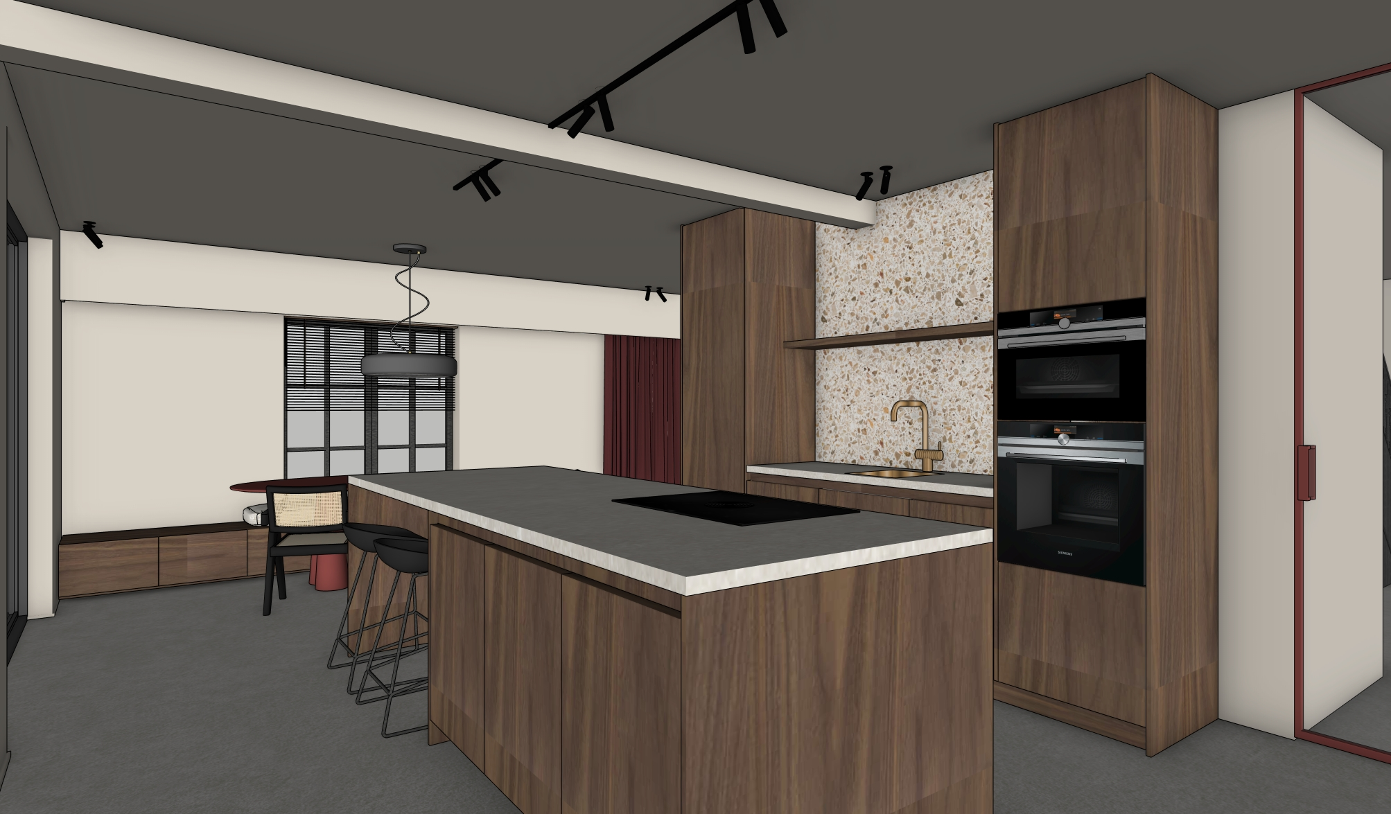 create an ultra high end photorealistic architectural interior render based strictly on the uploaded reference image the complete spatial layout dimensions proportions wall positions ceiling structure built in furniture kitchen configuration cabinetry volumes glazing camera position viewing angle perspective and composition must remain 100 identical to the reference no redesign no reinterpretation no relocation of any architectural or interior element this is a material lighting and realism upgrade only architecture fixed elements exactly as reference keep all walls ceiling levels beam niches cabinetry glass door shelving kitchen island tall units windows lamellas curtains seating bench and circulation exactly as in the reference image red metal framed glass door must remain identical in color proportions and position track spots ceiling spots and all fixtures remain exactly placed as reference floor walls ceiling floor greige ceramic tiles 90 90 cm satin mat realistic joints and scale all walls columns and ceilings farrow ball white tie warm sand beige tone ultra soft mineral leem appearance matte finish subtle texture ceiling beam kept exactly same color as ceiling wood cabinetry critical all wood decolegno poro noce ls40 warm dark walnut tone natural oak walnut balance satin mat lacquer all wood materials must be seamless non repeating pbr textures correct real world scale no visible tiling mirroring or pattern repetition subtle panel to panel variation correct veneer direction per surface natural depth and pore structure never flat never plastic never copy pasted kitchen materials equipment worktop marazzi berici bianco satin finish backsplash terrazzo exactly like reference satin finish sink undermount integrated drainer tap sink copper cooktop bora puxu flush mounted ovens siemens studioline chairs identical to reference lighting extremely important all ceiling spots and track lights must emit visible light beams soft architectural cones warm neutral temperature led under and above the shelf in the niche add a hidden warm led strip under the curtain valance washing the curtains and wall softly no dead lights no decorative only fixtures introduce soft natural sunlight from outside realistic direction subtle shadows balanced with interior lighting lighting style high end architectural photography windows curtains exterior window lamellas near dining area walnut curtains beige linen tone consistent with white tie walls exterior view minimalist garden between open fields calm natural soft horizon camera composition camera position lens feel height cropping and viewing angle must remain identical to the reference image full frame architectural photography look 24 30mm lens equivalent straight verticals no distortion no cinematic exaggeration render quality material realism ultra photorealistic 4k output physically based rendering pbr correct roughness reflections and micro imperfections visible material depth in terrazzo wood veneer ceramic floor painted walls natural reflection behavior no mirror look no cgi gloss subtle ambient occlusion no heavy contrast atmosphere warm architectural timeless refined high end residential interior calm daylight atmosphere with layered artificial lighting negative prompt always add avoid cgi look render look cartoon style illustration low poly plastic materials blurry output over sharpening wrong wood color repeated textures tiling patterns mirrored wood grain wrong scale added furniture removed elements wrong lighting dead lights overexposure underexposure harsh shadows cold lighting color shifts camera changes distorted perspective messy styling unrealistic reflections noise people clutter
