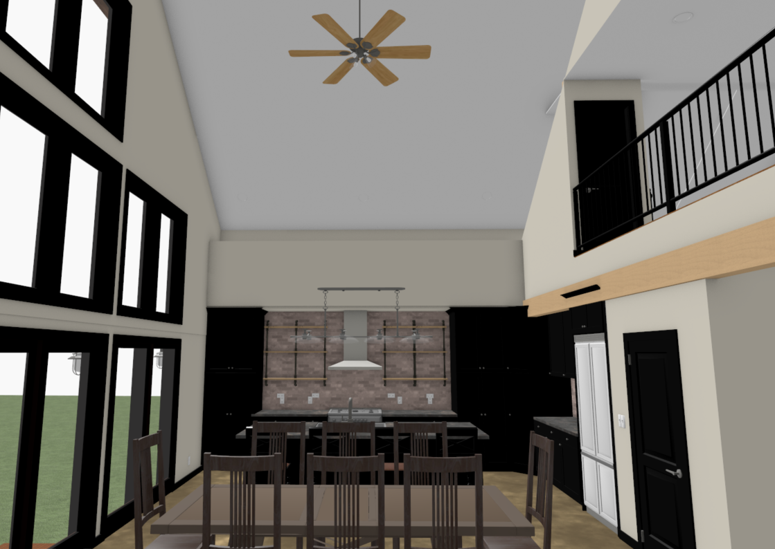 a high resolution photorealistic interior rendering of a modern farmhouse great room and kitchen with vaulted ceilings black framed floor to ceiling windows and an open loft railing above retain all architectural details black cabinetry wood ceiling fan exposed shelving stainless steel range hood farmhouse style dining table and pendant lighting capture natural daylight streaming through the large windows creating balanced highlights and shadows across the room through the windows show bright sunshine filtering through tree branches and a lush green forested background adding depth and realism emphasize realistic textures for wood metal glass and stone to highlight the craftsmanship and spatial openness of the design
