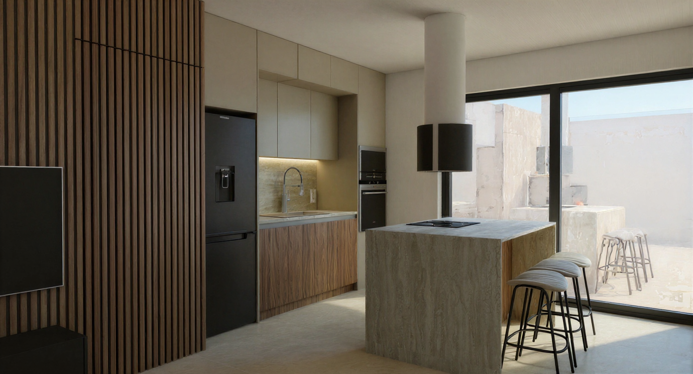 exterior shot vykresli realisticky d m se t emi byty a terasami kter jsou dd leny st nou na kterou navazuje pergola dodr uj geometrii v n vrhu d l c st na nahrazuje sloupky desky pro pergolu jsou um st ny nastojato vertik ln