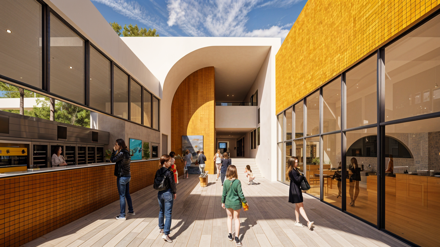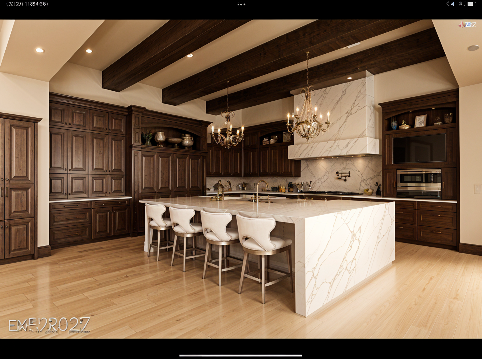 design me a more modern contemporary kitchen island with a waterfall edge design take out all of the ornate pieces the sides of the kitchen island to be a nice waterfall edge made of natural stone that is a cream beige color with nice veining also design me the hood vent to be more modern with the same matching natural stone as the kitchen island make the hood vent more straight and squared give me another modern style give me another design for hood that has some architectural modern elements that are straight