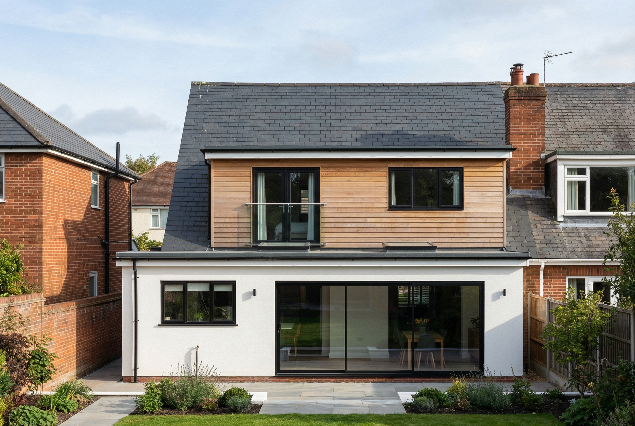 clean modern architectural exterior rendered in cinematic bright mid day lighting concrete driveway leading up to the home modern architectural style select grade horizontal cedar siding with white siding beautifully manicured landscape around structure with hedges and gardens black standing seam metal roof visible prominent cinematic lakefront in the background with mountains in the distance high fidelity photorealistic visualization crisp shadow falloff refined facade geometry soft atmospheric depth premium architectural photography mood ultra clean composition and materials vibrant sunset warm wood trusses