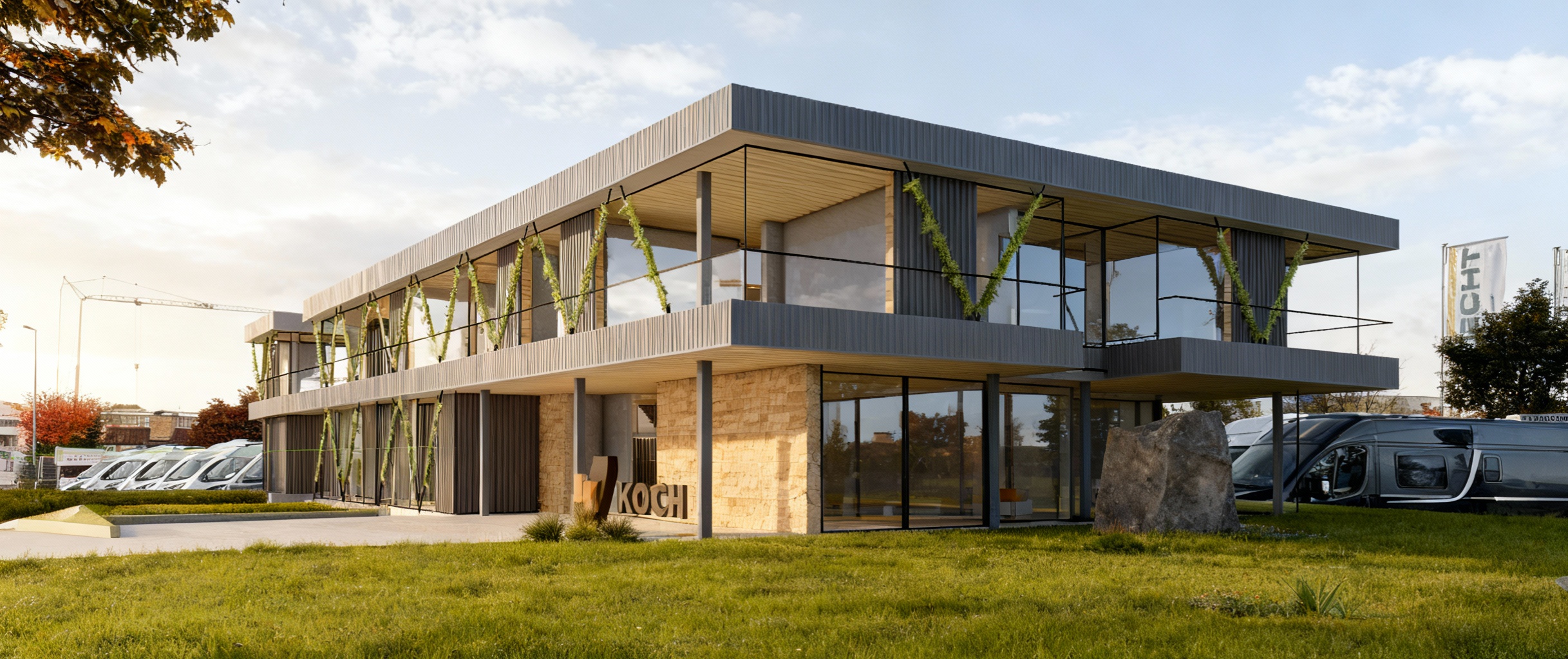 render a modern architectural building with soft gray walls and a warm wooden base add glass windows reflecting light enhancing the structure s sleek design set against a clear sky with a subtle gradient from light blue to soft white creating a peaceful atmosphere include soft shadows for depth and realism architecture
