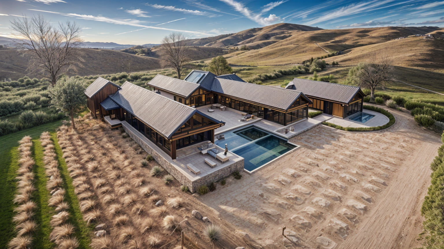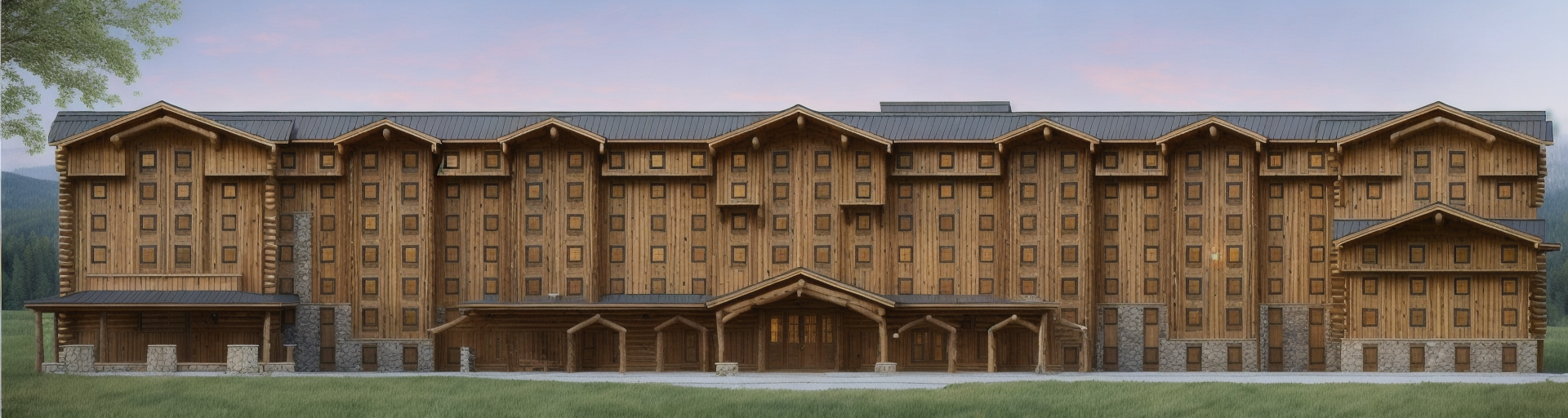 a cabin with stone plinth and light beige render facades with window details made of darker render stepped out bays in lighter colour the building is surrounded with trees of varying sizes and there are also some cars parked nearby to be seen the overall feel is sturdy rustic close to nature and wildlife it should create relaxing atmosphere and provide sense of adventure and exploration that the entire family can enjoy architecture
