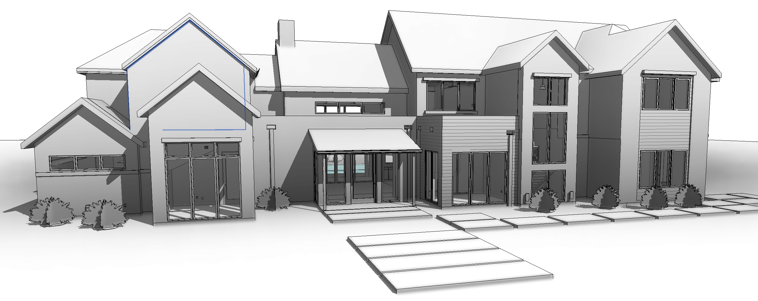 dark black exterior brick dark stucco warm wood verial siding black window frames black roof solid pivot door for front door grand front stoop with lead walk stepping down to front street