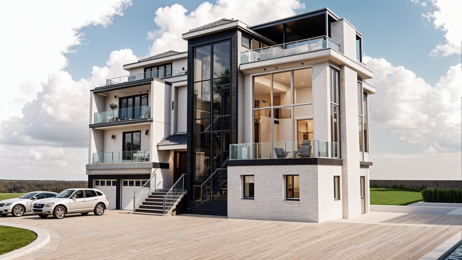do not change or reinterpret the architecture massing rooflines proportions or window locations of my house only replace surface finishes materials and environmental styling use the following material specifications inspired by the reference house stone warm light gray limestone blend with soft beige undertones subtle color variation and realistic depth random ashlar pattern with slightly rough texture siding vertical taupe gray board and batten with visible clean vertical lines light natural wood undertones and accurate highlights shadows trim accents dark bronze black trim around all windows and transition areas windows tall black aluminum clad frames with clean mullions divided lights where appropriate include crisp reflections of trees sky and sunlight roof dark charcoal architectural shingles with dimensional shadowing identical to the reference home lighting fixtures dark metal lantern style sconces where applicable only if already included in my cad do not add new fixtures unless the geometry shows mounting locations landscaping styling non structural optional rounded boxwoods along foundations purple lavender perennials and ornamental grasses a few pink crape myrtles if space allows lush green lawn with soft natural tree shadows a light gray gravel exposed aggregate driveway if a driveway is shown rendering requirements photorealistic lighting matching bright early afternoon with soft shadows maintain all forms dimensions and opening placements from my cad drawing camera angle should follow the uploaded cad perspective elevation high realism for reflections textures roof shadows and foliage do not generate new architectural features only apply the materials windows colors reflections landscaping style and lighting exactly matching the reference house