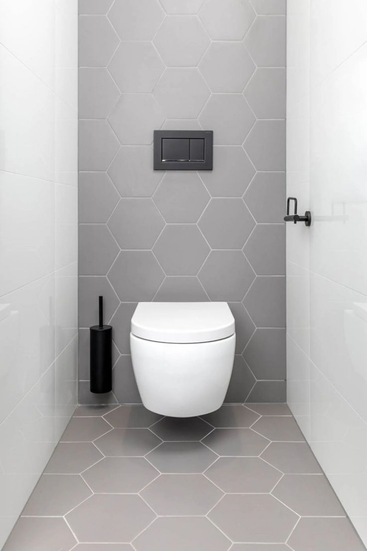 modernist interior shot render this toilet room with same hexagon tiles but with a light white ish beige color of tile architecture