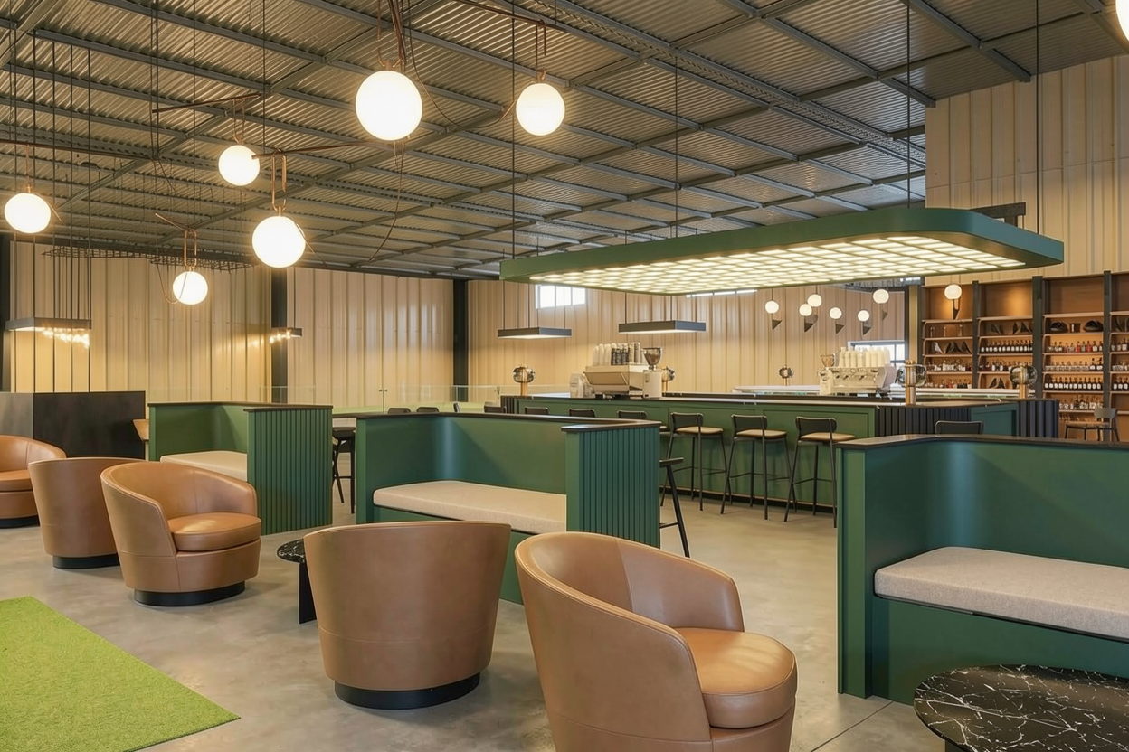 transform this image into a photorealistic rendering the building s walls are clad in wood and the window frames are black aluminum the railings are made of semi transparent glass the fence and columns are made of corten steel